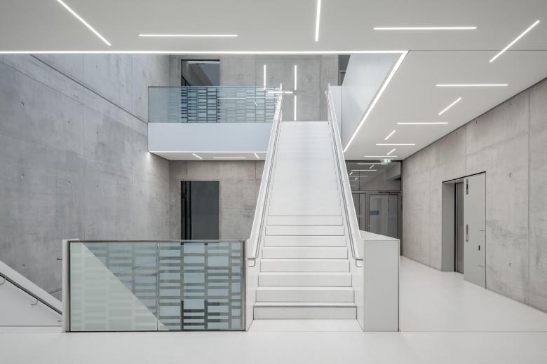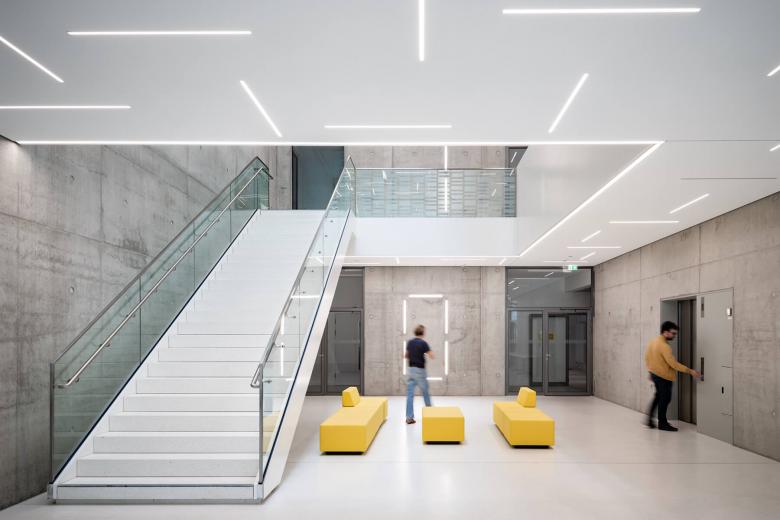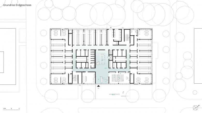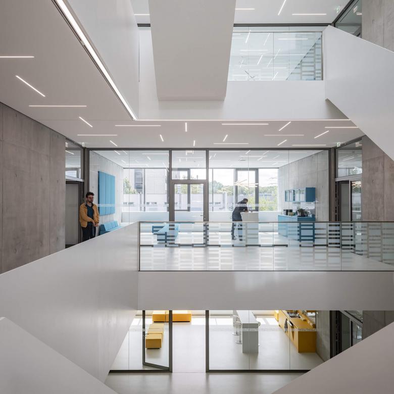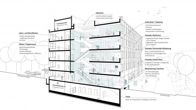 Der Grundriss des fünfgeschossigen Gründerzentrums ist als ringförmiger 3-Bund mit fassadenseitig umlaufenden Nutzungsflächen, einem ringförmigen Flur und einer unbelichteten Mittelzone organisiert. Ein zentraler mehrgeschossiger, offener Treppenraum in der Mitte des Gebäudes dient als mieterübergreifender Treffpunkt, der einen regen Informationsaustausch zwischen den Mietern ermöglicht. Mit geschossübergreifenden Sichtbezügen verbindet er die verschiedenen Etagen und schafft eine offene und einladende Atmosphäre.