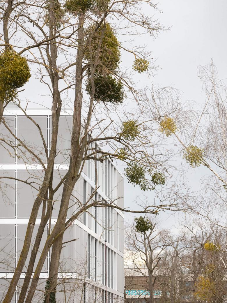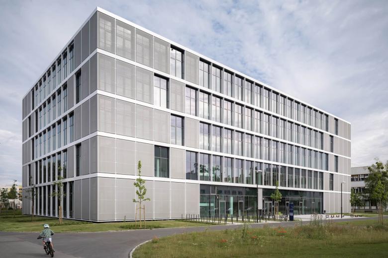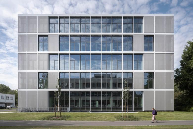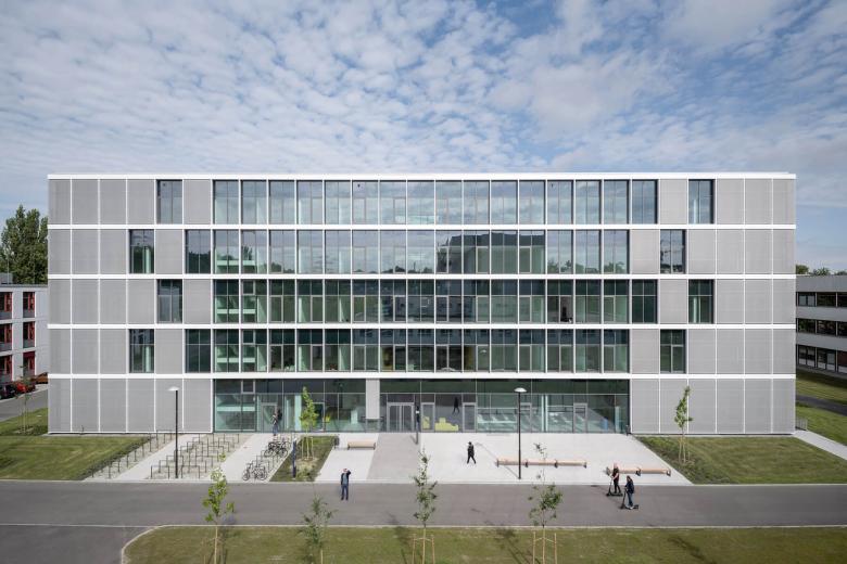 Sein Baukörper integriert sich nahtlos in die bestehende, rechteckige Campusstruktur. Das Gebäude erhält eine durchgehende homogene Gestaltung aus einem vorgesetzten Raster von Fassadenprofilen. Diese definieren den klar ablesbaren Kubus und betonen dessen Präsenz auf dem Campus. Die Eckbereiche des Gebäudes werden zusätzlich durch vorgesetzte, flächige, mit Textilgewebe bespannte Rahmen gefasst und die Raumkanten des Volumens im Kontext der Umgebung gestärkt.