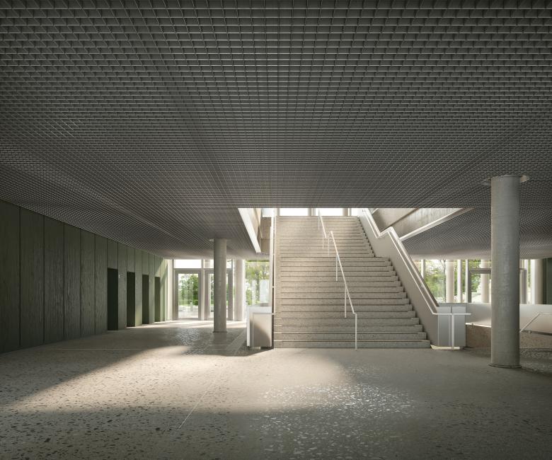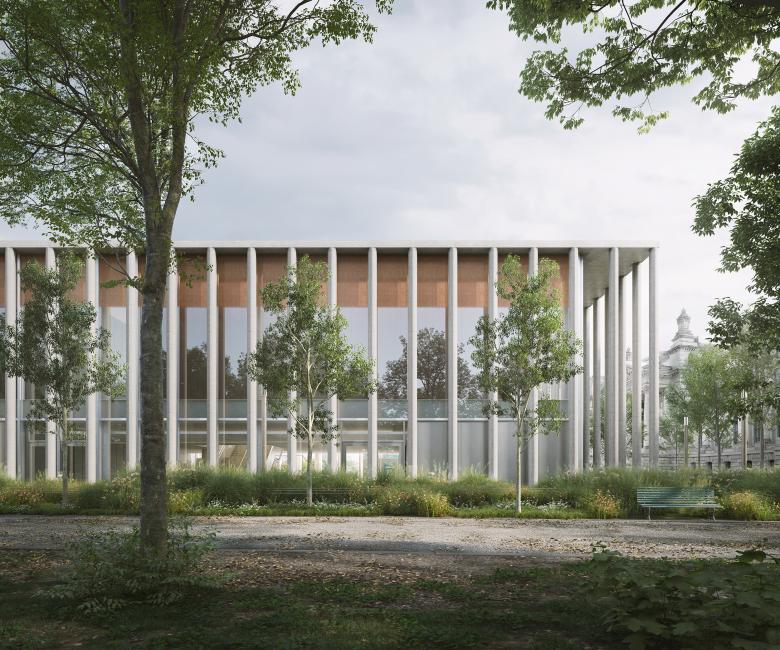 Der Neubau des Bundesinformationszentrums für den Deutschen Bundestag ist als schlanker rechteckiger Baukörper entlang der Scheidemannstrasse orthogonal zum Reichstagsgebäude und parallel zum Band des Bundes ausgerichtet. Das Gebäude ist von der Scheidemannstrasse abgerückt so dass ein grosszügiger Vorplatz entsteht auf dem die Besucher ankommen, sich aufhalten, sich sammeln und warten und vorallem einen grossartigen Blick auf die Regierungsbauten haben. Der Platz als Ort der Versammlung, des Austausches und der Abstimmung wird als demokratische Urfiguration erlebbar gemacht. Ebenfalls tritt so der Neubau gegenüber den Regierungsbauten zurück und verweist auf das eigentliche Ereignis, den Besuch des Bundestages.