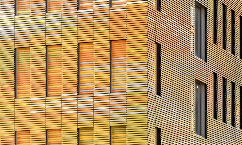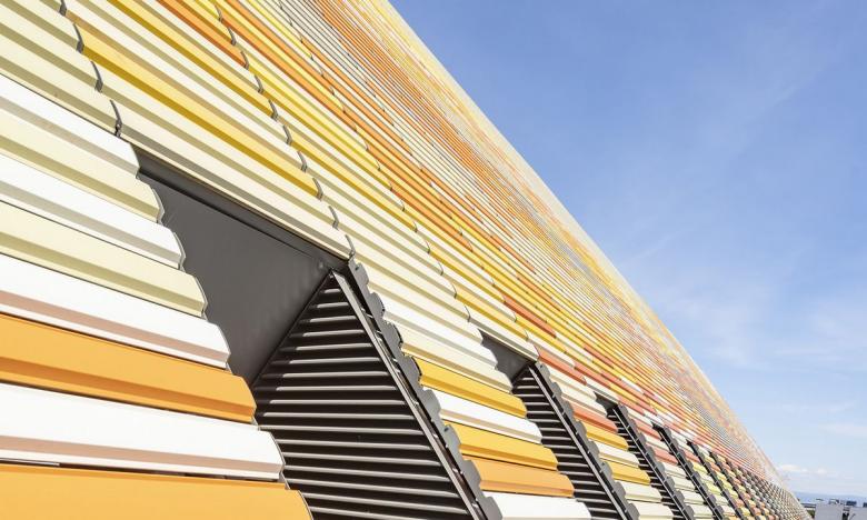 Die Gebäudehülle des CRBS, in welcher sich die technischen und ästhetischen Merkmale der Forschung verbinden, ist auch energetisch effizient. Sie besteht aus Aluminiumlamellen, die alle das gleiche Profil und Format haben. Die Lamellen können in einer festen Position verwendet werden, um ein Muster zu bilden, oder in einer beweglichen Position, um in Innenräumen das Tageslicht ohne Blendung zu nutzen.