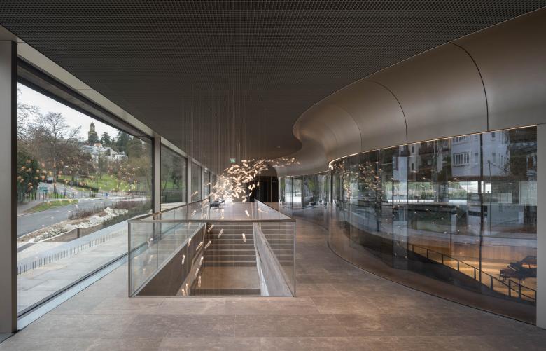Den Auftakt des Quartiers bildet das Hotel am Bahnhof, seitlich flankiert von der Musikakademie, die in die Hangkante geschoben wurde und nur über eine steinerne Platzwand in Erscheinung tritt. An der höchsten Stelle des Grundstücks liegt der Kammermusiksaal mit einem weit ausgreifenden Dach.