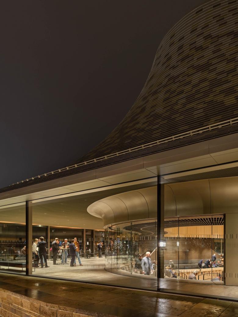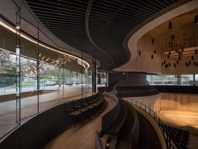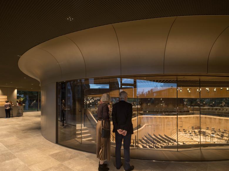 Eine breite, gläserne Fuge trennt das Dach des Konzertsaals vom steinernen Sockel und gibt dem Saalbau eine pavillonartige Leichtigkeit, die besonders von der höher gelegenen Parkseite die Erscheinung des Gebäudes prägt. Von dort gelangt man direkt in das obere Foyer des Kammermusiksaals, das den in der Mitte gelegenen Saal umfließt und allseitig Einblicke in den Saal freigibt. Die transparente Fuge öffnet den Saal zur Umgebung und zur angrenzenden Landschaft und wirkt wie ein Signet für den ambitionierten kulturellen und gesellschaftlichen Ansatz der Kronberg Academy.