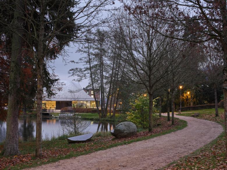 Wie in einem Landschaftspark ist das ansteigende Gelände in Terrassen, Treppen und Wege gegliedert, Steinwände erzeugen einen spannungsvollen Wechsel offener und gefasster Außenräume.