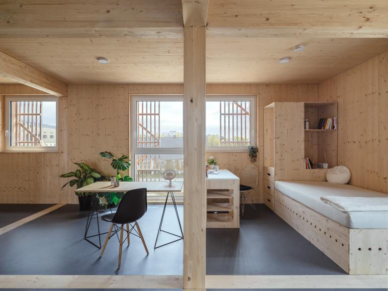 Das Collegium Academicum ist Wohnheim und Begegnungsstätte für Studierende und junge Berufstätige. Im Mittelpunkt stehen Nachhaltigkeit und Innovation. Die Bauherrschaft hat in Eigeninitiative Fördermittel und Unterstützer organisiert, um bezahlbaren Wohnraum zu bauen. Das Tragwerk ist eine Holzkonstruktion, welche durch form- und kraftschlüssige "Nur-Holz-Verbindungen" gefügt wird. Hier wurden alte, traditionelle Zimmermannsverbindungen neu gedacht und wirksam eingesetzt. Um die Lasten in den Anschlüssen niedrig zu halten und die Möglichkeit der flexiblen Raumaufteilung zu schaffen, wurde ein enges Konstruktionsraster gewählt. Die Aussteifung des Gebäudes erfolgt über Brettsperrholz-Scheiben in Wand- und Deckenebene. Die Laubengänge funktionieren als vorgesetztes Stabtragwerk. Im Gebäude gibt es Gemeinschaftsflächen wie eine Aula und eine Werkstatt, für den Bau eigener Möbel. Mit dem im Vorfeld gebauten Demonstrator konnte die Montagefähigkeit der geplanten Konstruktion geprüft und die Testmessungen bezüglich des Schallschutzes durchgeführt werden. Das Projekt ist NaWoh zertifiziert.
