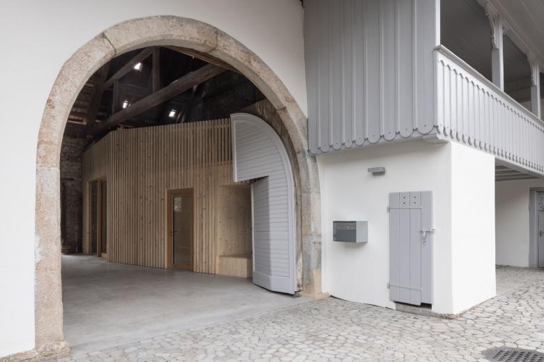 In der Scheune sind die Zwischenböden und Innenwände abgebrochen und ein ausserordentlich grosszugiger Zwischenklimaraum geschaffen worden, der sich durch das Öffnen der zwei Scheunentore regulieren lässt. Ein neues, grosses, auf einer Höhe von 1.5 Metern, angeordnetes Fenster bringt viel Licht in die Scheune und ist gleichzeitig von aussen grösster Zeuge des neuen Innenlebens. Ein eingeschossiger Anbau mit Höhenversatz in Holzbauweise besetzt neu den Raum der ehemaligen Stallungen. Für seine Aussenhaut aus naturbelassenem Fichtenholz wurde auf ein Baumaterial mit langer Tradition zurückgegriffen. Im Innern beherbergt der Anbau das Entrée und die Küche, die beide mittels Durchbrüchen mit dem alten Wohnhaus verbunden sind. Von der Küche erlauben grosse Fenster sowohl den Blick in die Scheune als auch in den Garten. Das Dach des Anbaus, das als Aufenthaltsraum genutzt wird, verweist mit seinen zwei Ebenen auf die traditionell auf verschiedenen Höhen angeordneten Heuböden.