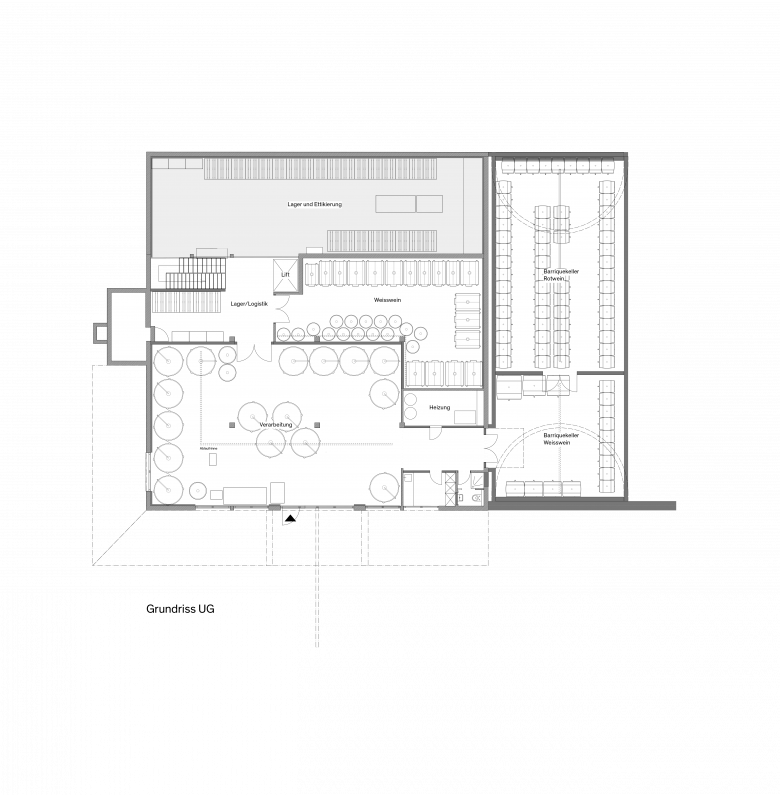 Unterstützt durch die nach südwesten abfallende Hanglage ergibt sich die Zufahrt zur Anlieferung der Weintrauben in die Verarbeitungshalle im Untergeschoss des Gebäudes. Dadurch ist eine räumliche Trennung von Produktion / Lagerung und Publikumsverkehr gegeben. Die Verbindung beider Geschosse im Gebäudeinneren erfolgt durch eine Treppe und einen Aufzug. Die Grundrisse und räumliche Abfolgen des Konzepts sind auf die Arbeitsabläufe des Weinguts abgestimmt.