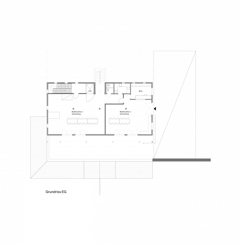 Im Erdgeschoss des Gebäudes befinden sich, über den Haupteingang zugänglich, die repräsentativen, öffentlichen Bereiche wie Verkostungs- und Eventräume. Der Weinverkauf sowie Zugang zur grosszügigen Aussenterrasse mit Feuerstelle sind ebenfalls im Erdgeschoss verortet.