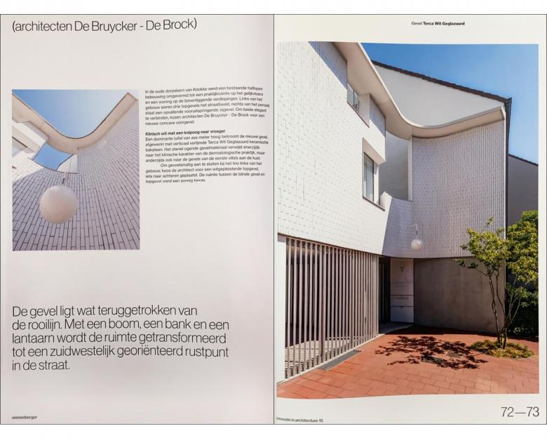 The new façade with a concave shape creates a gentle transition between the three gable roofs and the protruding façade. A dominant awning with a height of 6m, the approved height of the cornice crowns the new façade in a white glazed ceramic brick, vertically bonded.
