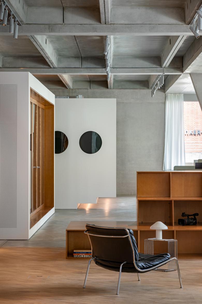 Die Parkettfläche hebt den Lounge-Bereich durch ihre warme Optik klar vom industriell geprägten Umfeld ab. Verlegt als klassischer Schiffsboden überrascht die rund 40 Quadratmeter grosse Echtholzfläche mit einem ungewöhnlichen, dynamischen Auftritt. Erzielt wird dies über die diagonal zur Verlegerichtung verlaufende Maserung. Mit der Drehung der Holzmaserung um 45° zur Diele lässt Spinpark, entworfen vom Schweizer Architektur- und Designstudio atelier oï, völlig neue Fussbodenoptiken entstehen. Ein besonderes gestalterisches Detail ist die 4:3-Flächenproportion des Lounge-Bereichs, inspiriert von klassischen Filmformaten. Dieser bewusste Designgriff würdigt das Kerngeschäft von Dynamic Frame und verleiht dem Raum symbolische Präsenz.