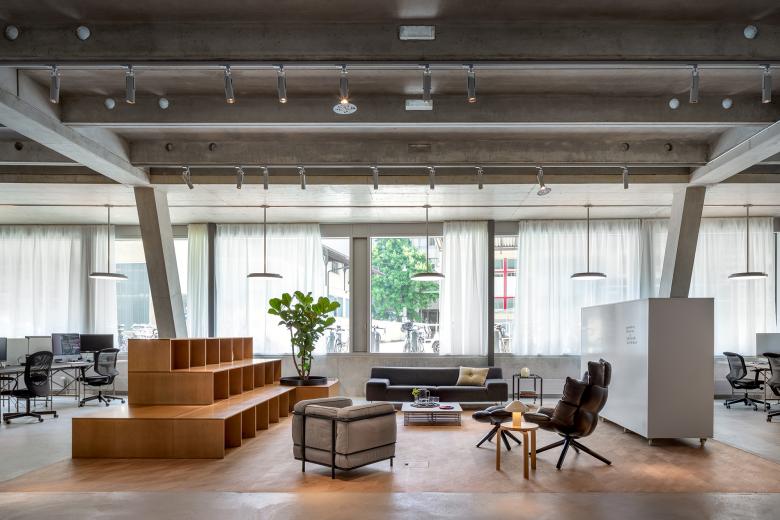 Im ehemaligen Industrieareal Binz, das sich in den letzten Jahren zu einem pulsierenden Kreativviertel entwickelt hat, bezog Dynamic Frame ihre neuen Büroflächen im Erdgeschoss. Der architektonisch markante Neubau zeichnet sich durch terrassenförmige Elemente und flexible Innenräume aus. Viele Oberflächen wurden im veredelten Rohzustand belassen: Sichtbetonwände und geschliffener Zementestrich dominieren das Bild.