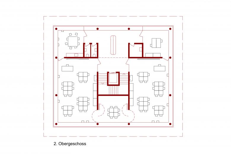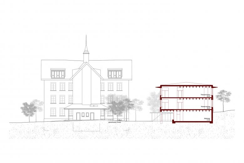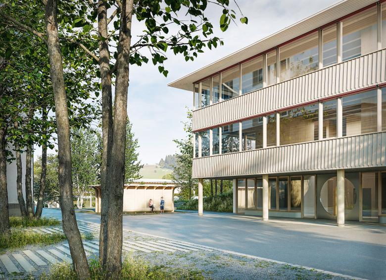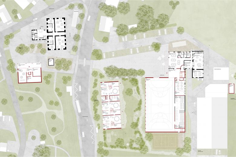 Das neue Schulhaus steht als Punktbau zwischen Kirchpark und dem Pausenplatz. Der Kindergarten rückt an die Hauptstrasse heran und trennt zur Doppelturnhalle einen ruhigen und gut besonnten Kindergartenhof ab. Der Gemeindesaal bleibt erhalten und die neue Doppelturnhalle ersetzt die bestehende Turnhalle eins zu eins.