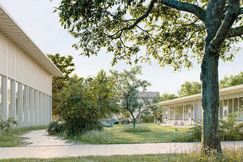 Die als Cluster organisierte Tagesstruktur ist im Erdgeschoss des Gemeindesaals gut erreichbar und attraktiv mit dem Aussenraum verbunden.