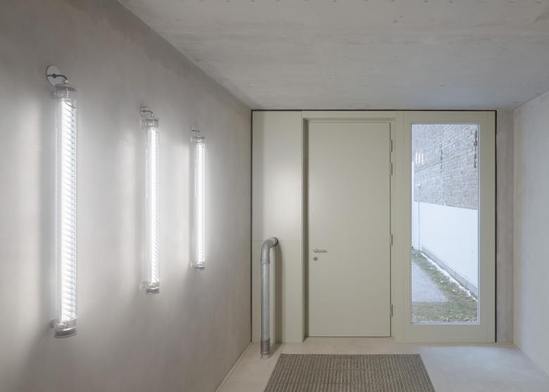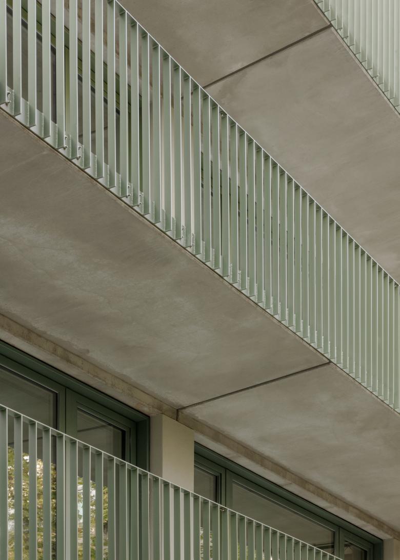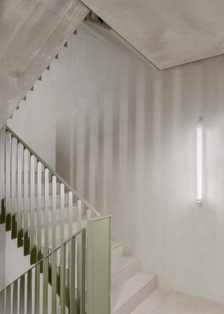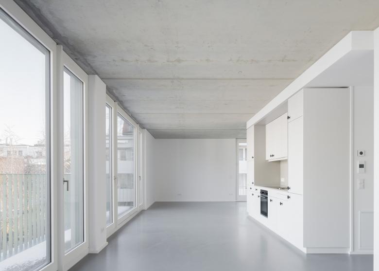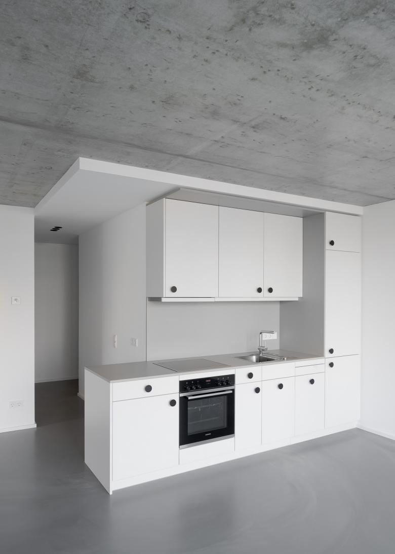 Zusammen mit den großen Fensterflächen erzeugen diese Elemente eine freundliche, leichte Stimmung, die auch im Inneren der 15 Wohnungen und der großen loftähnlichen Dachgeschosswohnung mit Terrasse und Blick über die Dächer spürbar ist. Bewusst haben wir den rohen Charme der tragenden Betonwände und Decken in Kontrast mit den fein gespachtelten leichten Trennwänden gesetzt. Zusammen mit den Einbauküchen und den raumhohen Türen wirken diese wie eingestellte Möbel und bieten den Bewohnern jede Menge Möglichkeiten hier ihre Lebensräume zu gestalten.