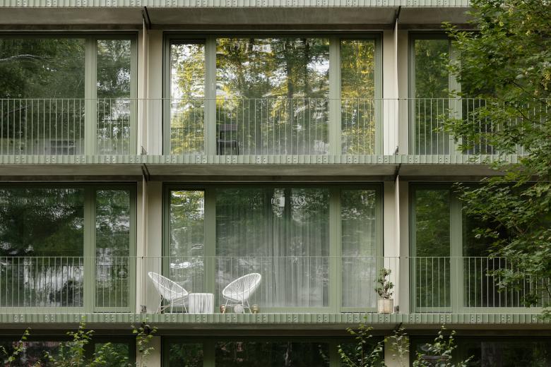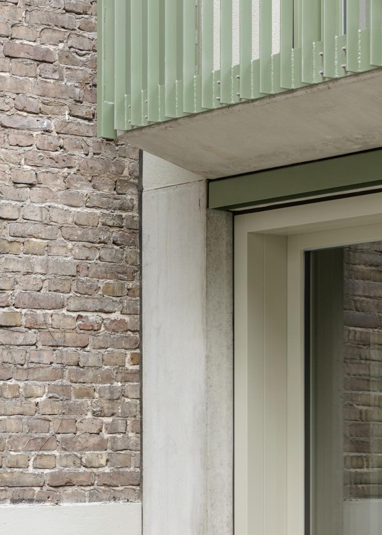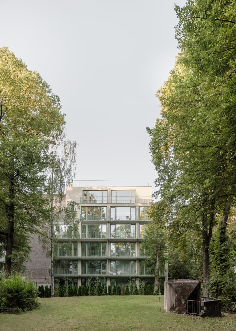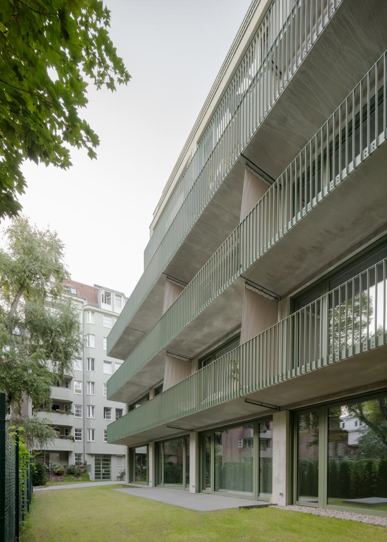 Der Massivbau wurde an eine bestehende Brandwand angebaut. Große Fenster und Balkone öffnen das Haus zu einem parkartigen Gartengrundstück. Der helle, grau-grüne Putz der Fassade in den oberen Etagen, die eisenglimmergrünen Metallgeländer und Fensterrahmen und der Sichtbeton im Erdgeschoss korrespondieren unaufgeregt mit dem umgebenden Grün der Bäume und der ziegelfarbenen historischen Sichtmauerwerk- Brandwand des Nachbarhauses.