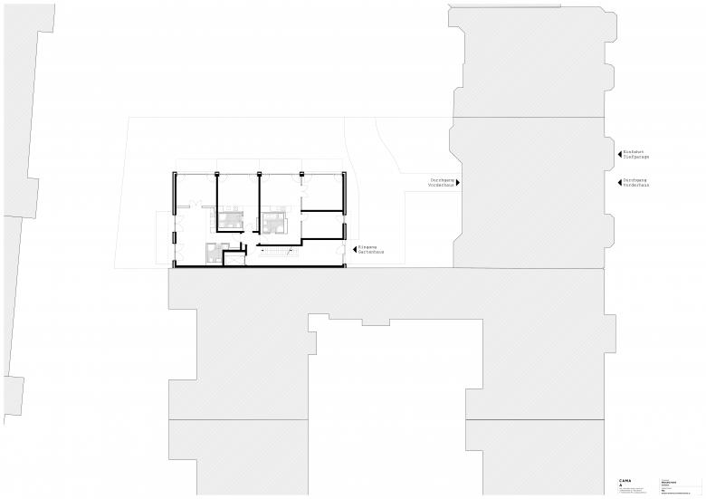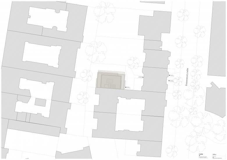 Im Sinne der zunehmend gewünschten Nachverdichtung der Westberliner Blockstruktur entwickelten wir im Auftrag des Eigentümers die Idee das Gartengrundstück mit einem neuen, mehrgeschossigen Wohnhaus zu bebauen und konnten schließlich auch das Stadtplanungsamt von dem Projekt überzeugen. Eine der größten Herausforderungen dabei war die schwierige Erschließung des Baugrundstücks. Das bestehende Vorderhaus besaß (und besitzt) keine Durchfahrt zum Grundstück, lediglich die unterirdische Zufahrt zur Tiefgarage. Deshalb musste sowohl der Abbruch der alten Tiefgarage als auch die Logistik für den gesamten Neubau über bzw. unter dem Vorderhaus organisiert werden.