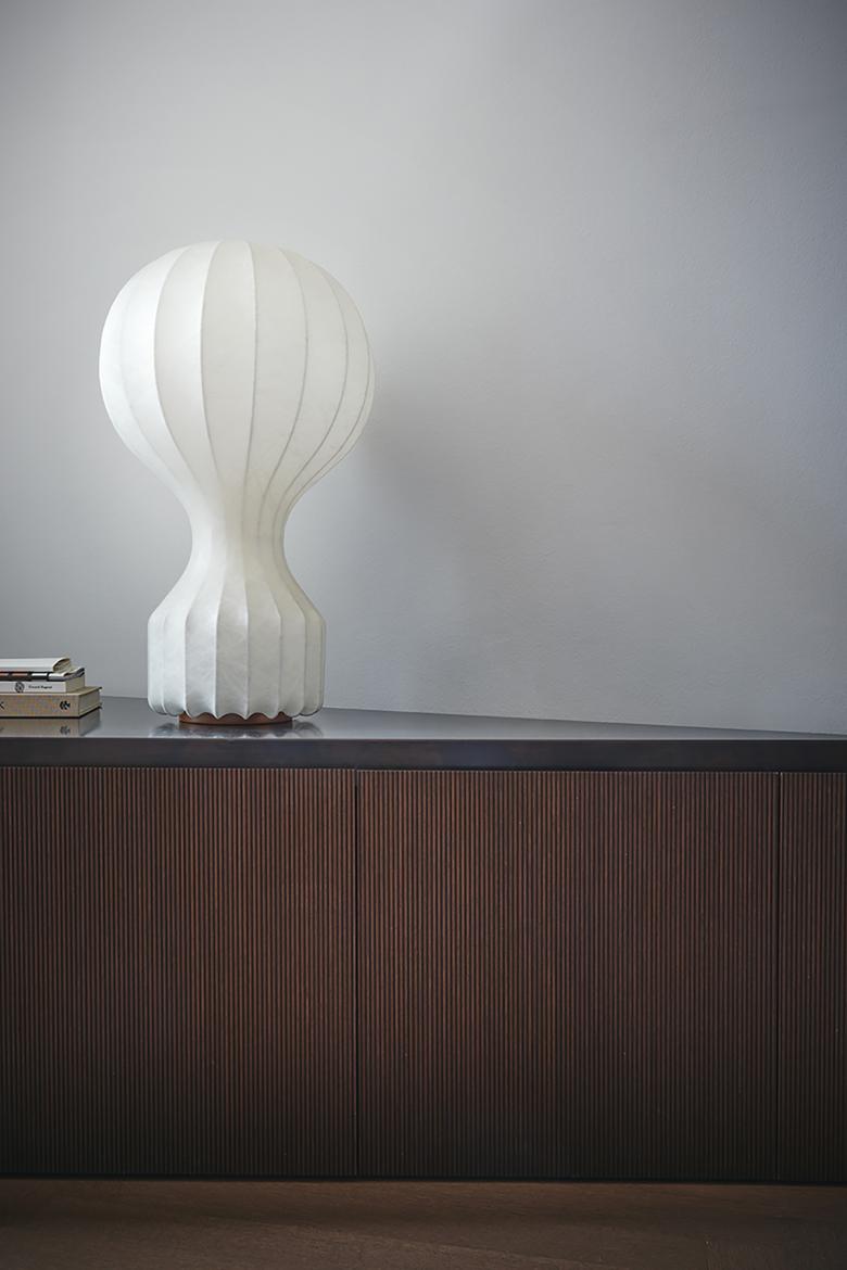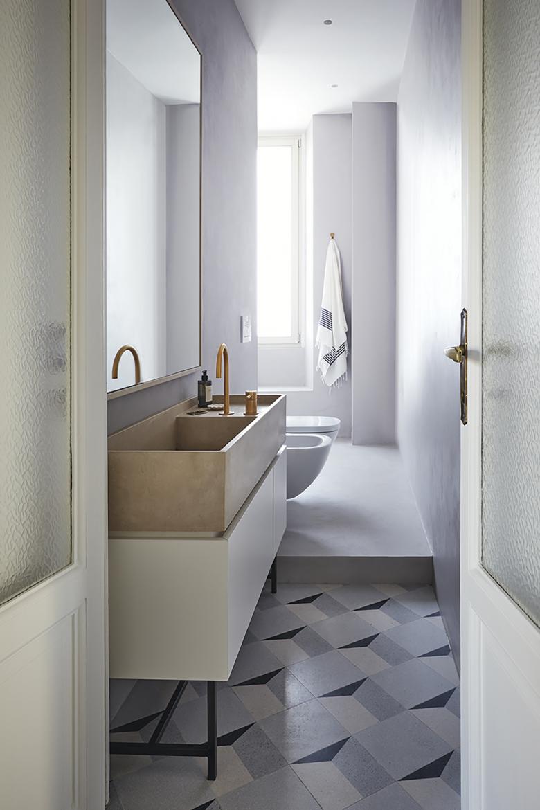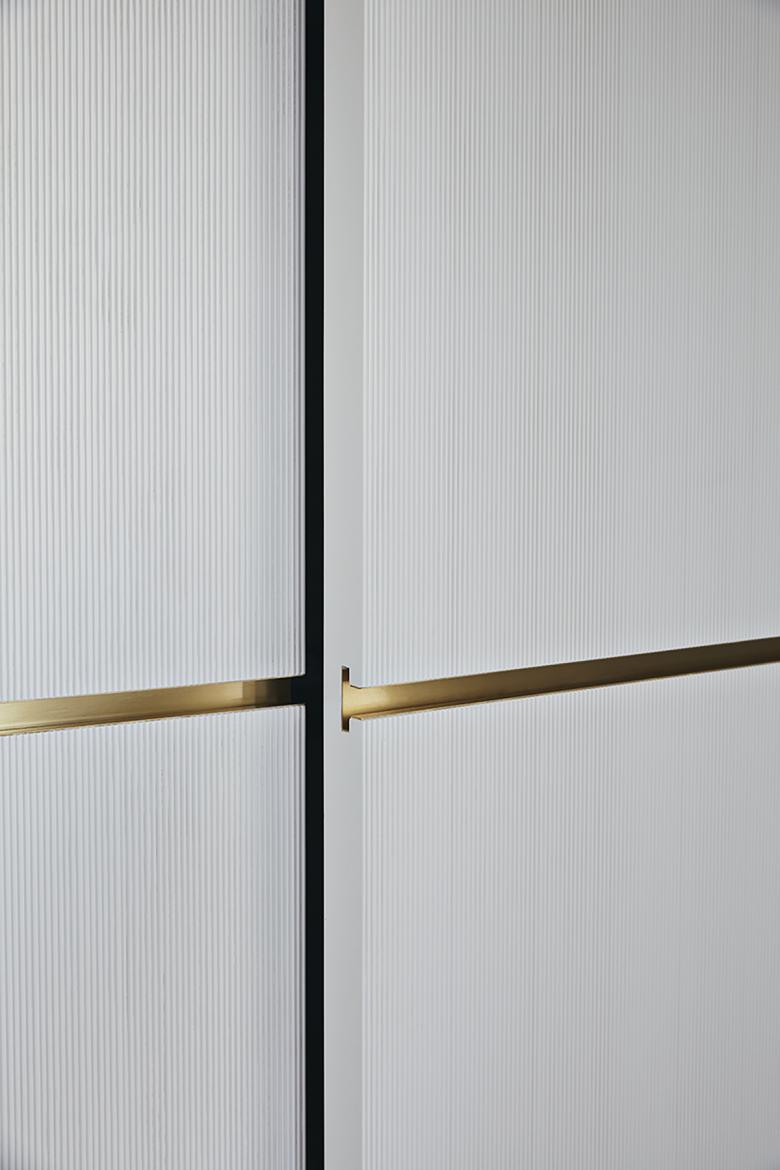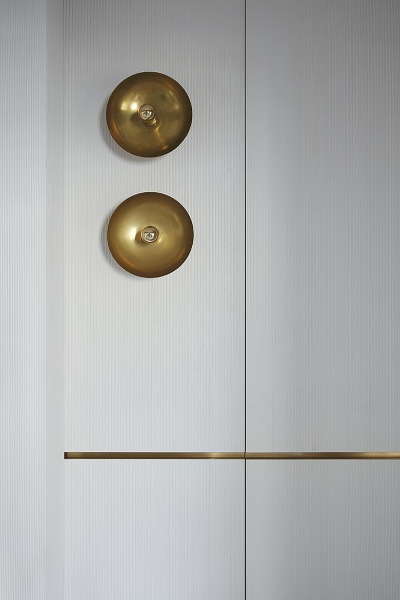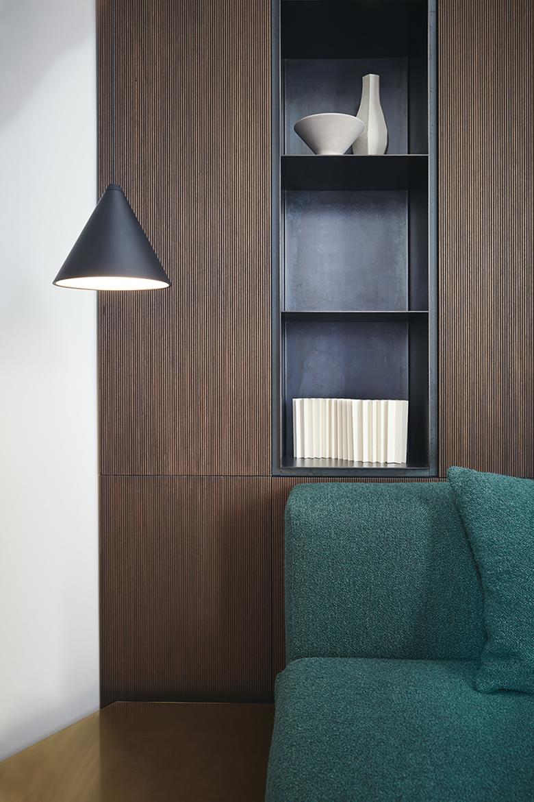 The vocation of this space is to use on the floor the materials of the time, such as terrazzo floor, but reinterpreted in a contemporary way through the choice of rational and essential geometries and the introduction of three-dimensional materials and finishes such as brass, raw iron and wood “cannettato” on the walls, which are repeated in essence and colour in the other rooms.