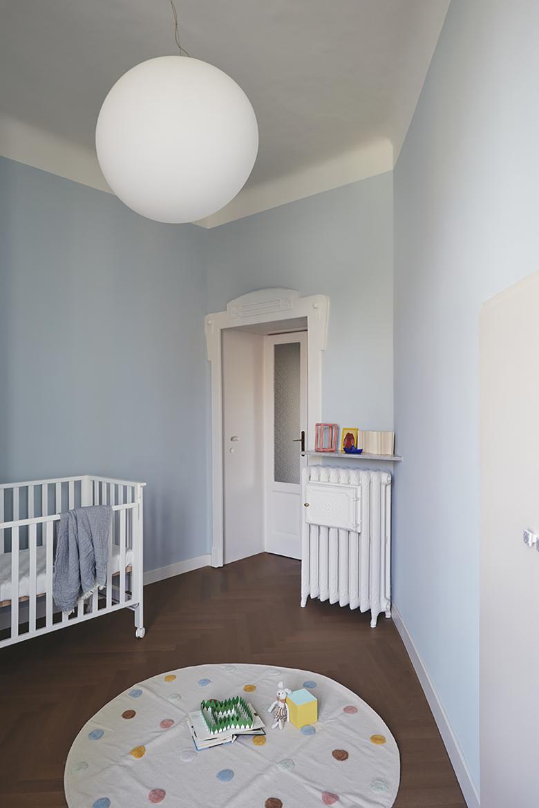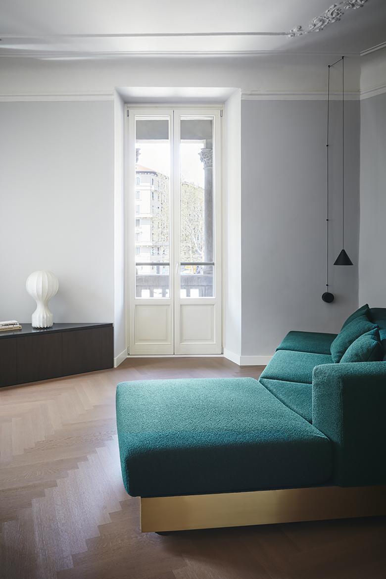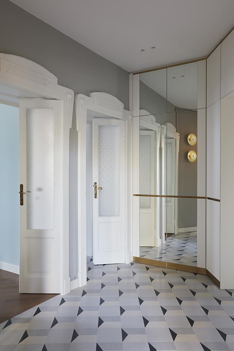 Our design was based on the desire to follow the diagonals and create spaces through a customised interior that look out onto both the Art Nouveau balcony and the heart of the house, the entrance foyer, which immediately became the connecting element between the different rooms and the point from which, thanks to the mirror panelling, you can catch a glimpse of each room.