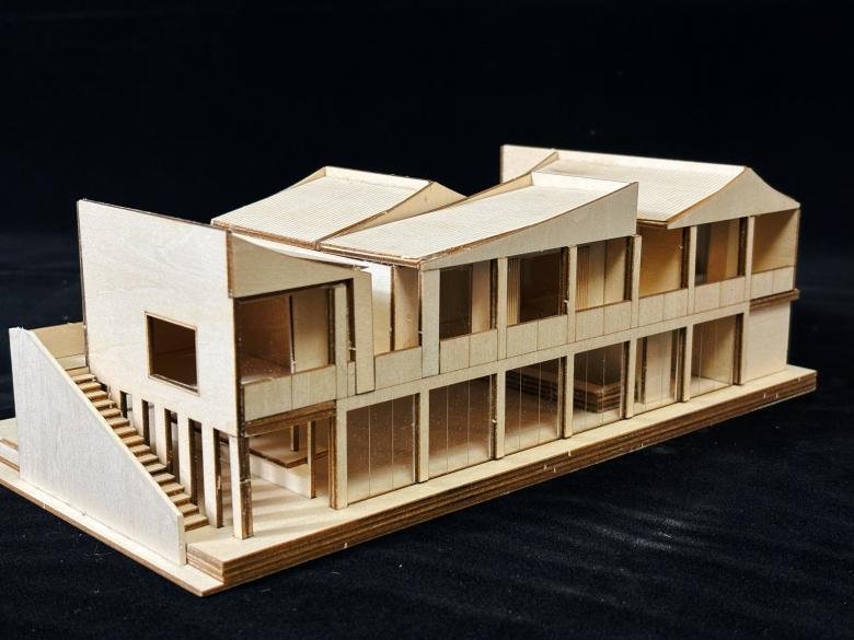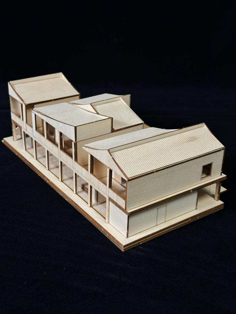基于已然确定的钢结构柱网布局,在建筑的空间布局上我们进行了调整。在一层空间中,将咖啡吧的辅助性空间集中于一侧并结合楼梯整合布置,利用咖啡吧空间中连续的玻璃门窗构件形成的透明感,使得一层空间以一种轻质透明的状态介入到古树与自然景观之间。对于二层的民宿空间,我们借鉴传统村落的形式,以不同坡向的屋面来组成小型的群落空间,借助平台“浮”在自然环境之中,跳出原有建筑整齐的平屋面形式。