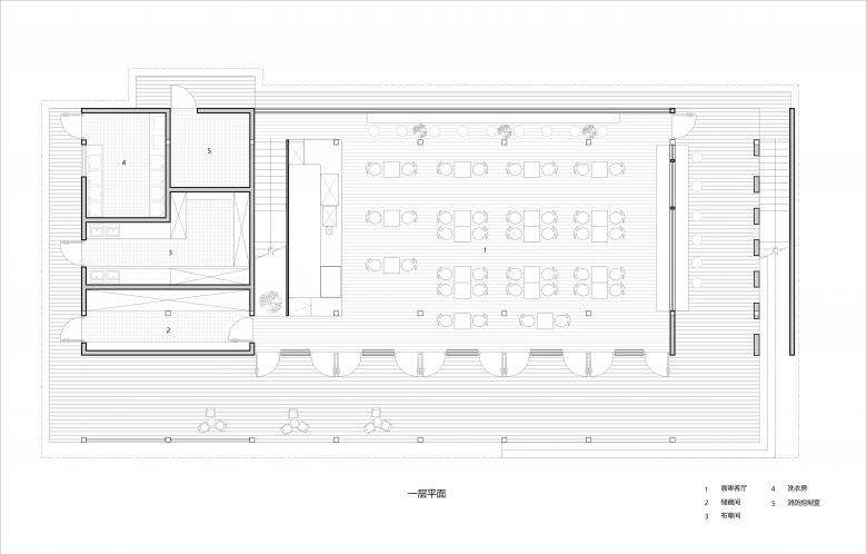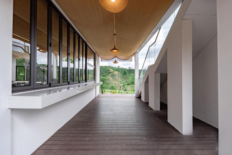 一层的咖啡厅南侧以多扇可开启透明玻璃门为界面,配合游廊形成半开放空间,我们希望以这样的多层次处理,让人在回味咖啡时得到于院内古树环境相接触的体验,而北侧则以离地1m的玻璃窗配合长吧台,人在此在眺望远山自然风景后,抿一口当地咖啡,融入到云南山野乡村的质朴之中。