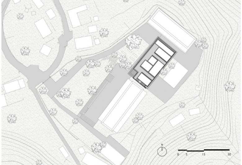 场地踏勘之时,建筑的钢结构柱网基坑已然成型,旧规划方案中的客厅设置在原有小学教室与宿舍的中间,整体连成线型空间格局,却也隔开了场地空间中庭院景观与外侧山体自然森林的呼应关系,故此咖啡客厅的设计作为连接场地的元素而诞生。