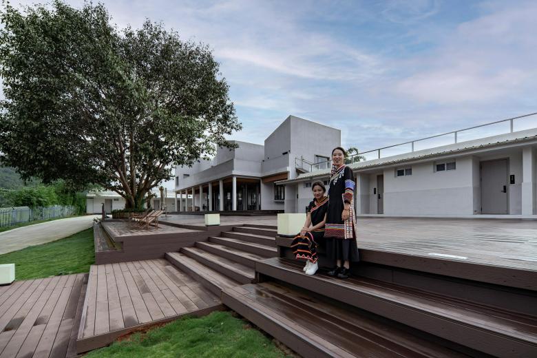 在院落整体布局方面,我们对院落的景观布局进行调整,保留一定程度的运营灵活性。我们希望场地内预留出的木质活动平台与休闲草坪能够容纳更多的社区活动,使得众多研学学子更好地融入到当地居民社区生活中。值得一提的是,在项目建设中,或许是出于某个灵光一现的念头,原本分离的客厅与小学宿舍被一座钢结构玻璃楼梯连接起来,通过对小学宿舍屋顶的利用增添了院落的活动空间,增加了社区活动中院落的观赏空间,人、乡村、自然在这一刻得以融合,这才实现了农村社区的共建共享,得以一同拥抱的自然馈赠。