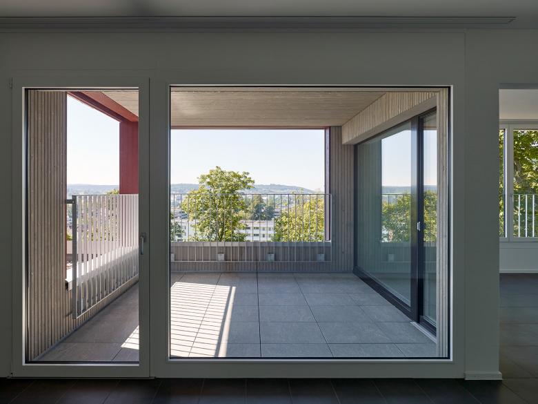Die Setzung der fünf unterschiedlichen Volumen um einen gemeinsamen Platzraum, von wo aus alle Häuser erschlossen werden, betont den Verlauf der vorhandenen Topografie und ermöglicht spannende Ausblicke in die umgebende Landschaft ebenso wie über die Stadt Aarburg. Die aussenräumlichen Qualitäten finden ihre Fortsetzung in den differenzierten Grundrisstypologien. Zwei- und dreispännig angelegt, sind die Häuser statisch und installativ konsequent und effizient ausgebildet. Die klare Grundstruktur zeigt vielfältige Möglichkeiten zur Grundrissentwicklung der rund 145 Wohnungen. All diese Massnahmen tragen dazu bei, dass die sehr umfassenden Vorgaben der 2000-Watt-Gesellschaft eingehalten werden können.