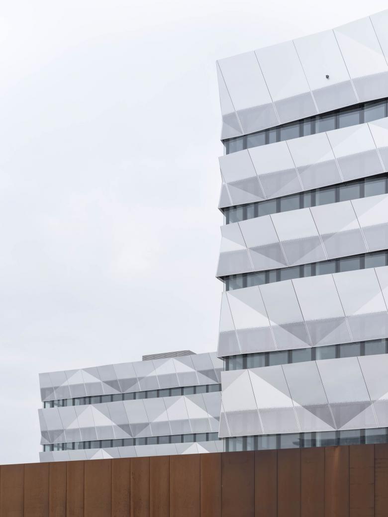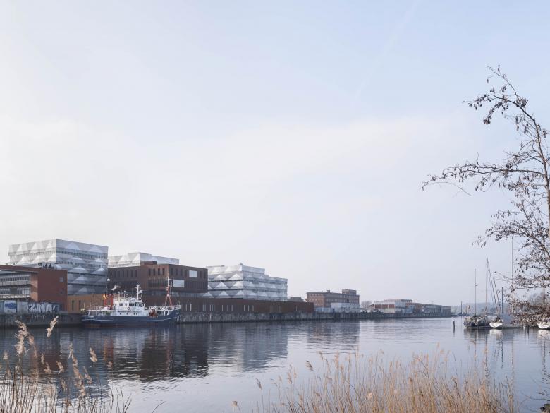 Der Erweiterungsbau des Zentrums für Ozeanforschung entstand am Mündungsbereich der Schwentine an der Kieler Förde. Mit einem Sockel aus Cortenstahl, der die bauliche Kante des bestehenden Gebäudes fortsetzt, integriert er sich in die von Ziegelbauten geprägte Umgebung. Der Sockel nimmt die Lager für Expeditionsgeräte und Labore auf und wird durch Patios gegliedert. Darüber erheben sich fünf Kuben unterschiedlicher Proportion und Höhe für die Forschungsbereiche, die mit einer prismatisch reflektierenden Glas-Alufassade dem Gebäude eine gewisse Leichtigkeit geben. Aus dem Zusammenspiel zwischen dem hermetischen, mit der Umgebung korrespondierenden Sockel und den Glaskörpern, in denen sich die maritime Lichtstimmung des Ortes fängt, entwickelt sich das architektonische Thema des Hauses. Eine Sonderstellung nimmt der Kubus für die öffentlich zugänglichen Bereiche mit Bibliothek und Konferenzbereich ein, der ebenfalls mit Cortenstahl verkleidet ist. Um den alltäglichen Austausch der Wissenschaftler zu fördern, werden an den Fluren informelle Aufenthaltsbereiche und Besprechungsräume mit Blick auf das Wasser und die institutseigenen Forschungsschiffe angeboten.