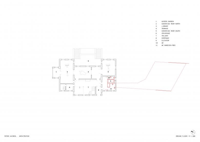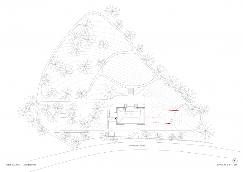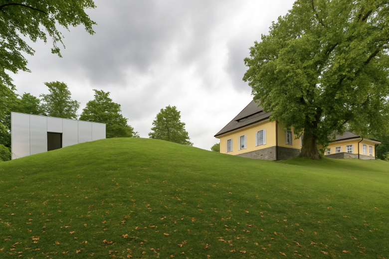 Der Architekt ging bei seinem Entwurf von der Prämisse aus, sowohl den Park als auch das Gebäude weitestgehend unverändert zu belassen. Das Bauvolumen des neuen unterirdischen, expressiven Saals integriert sich in den Hang an der Südseite des Hauses in das historische Ensemble. In der sanften Hügellandschaft des Parkes ist er nur an seinen beiden umrahmten Öffnungen erkennbar: Edelstahlschwerter, die in den Hügeln des Parkes stecken, spiegeln den Himmel, den Park und die Villa und markieren einen Zugang.