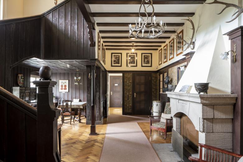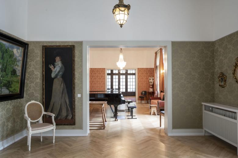 Die Anmutung des denkmalgeschützten Hauses und des Parks bleibt von allen Ansichten bestehen. Der Hügel des Parks gibt das Geheimnis in seinem monumentalen Inneren nicht Preis.