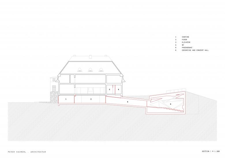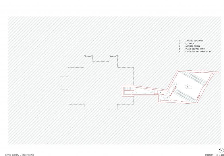 Das Bestandsgebäude wurde nur im Erdgeschoss und im neuen Gartengeschoss partiell umstrukturiert. Dafür wurde der Keller um 60 cm in die Tiefe erweitert. Durch die zusätzliche Raumhöhe entstand ein vollwertiges Stockwerk, das Platz für drei weitere Übungsräume, eine Lounge, eine Kantine und ein Foyer bietet. Ein neu eingebauter Fahrstuhl ermöglicht zudem die weitgehend barrierefreie Erschließung des Hauses. Die Architektursprache sowie die Möblierung in diesem Bereich orientieren sich an der herrschaftlichen Architektur des historischen Gebäudes und führen diese zeitgemäß weiter.