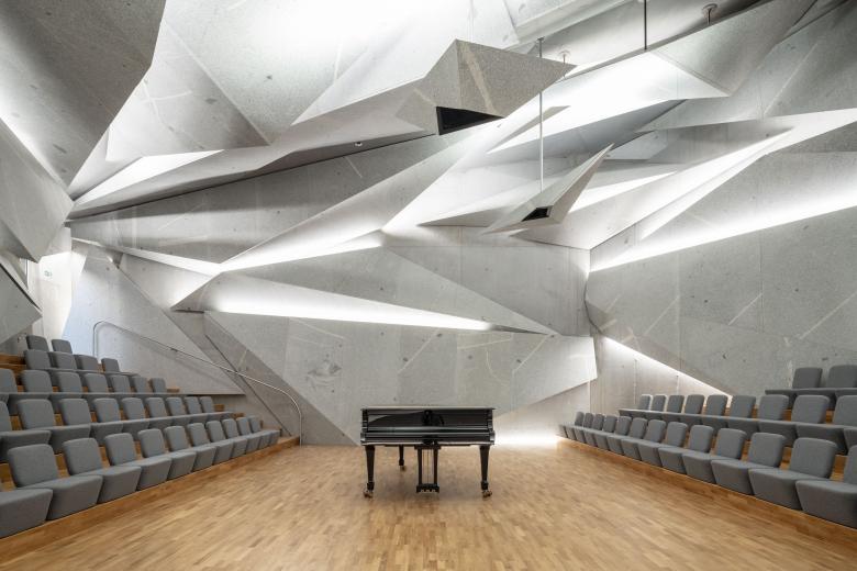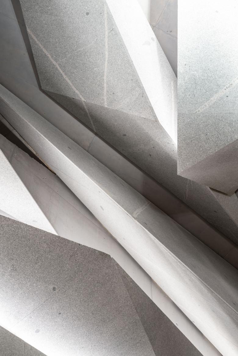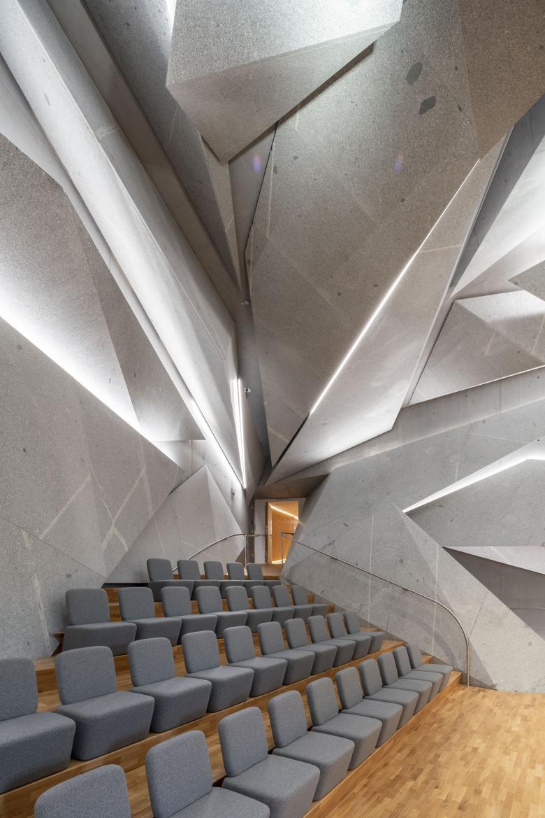 Die splitterartigen, tetraederförmigen Granitelemente definieren die räumliche Wirkung, erscheinen körperhaft und bewegt und sind so angeordnet, dass sie die Akustik des neuen Saales modellieren.