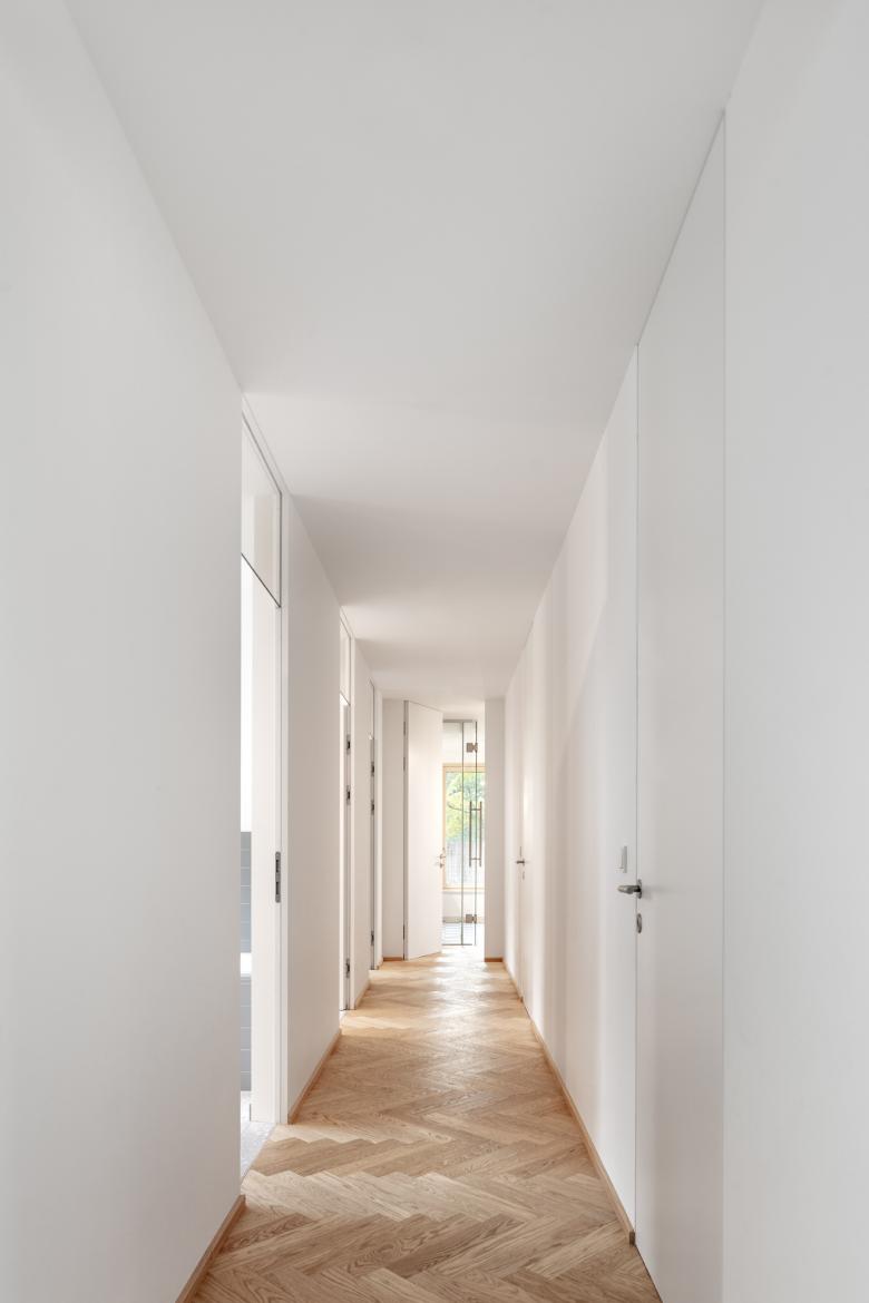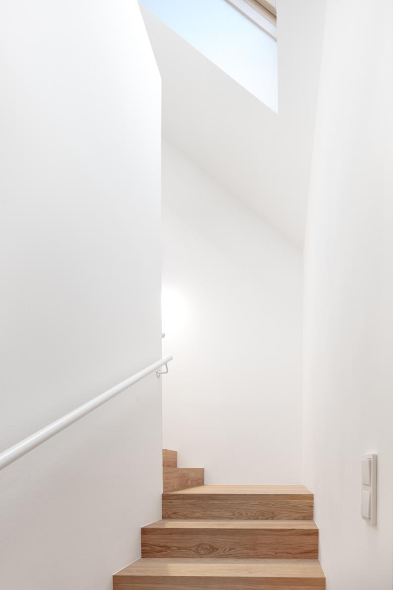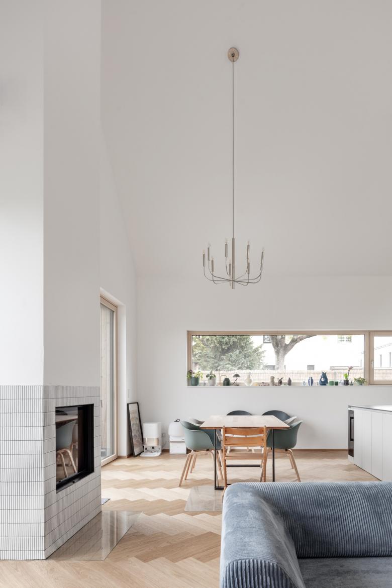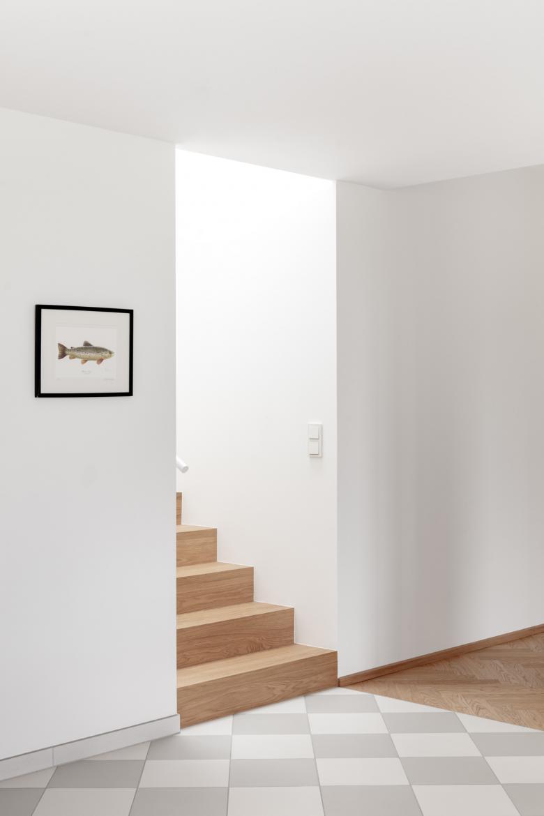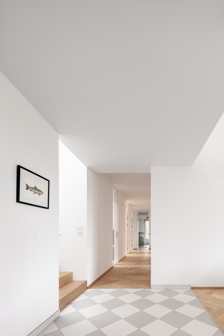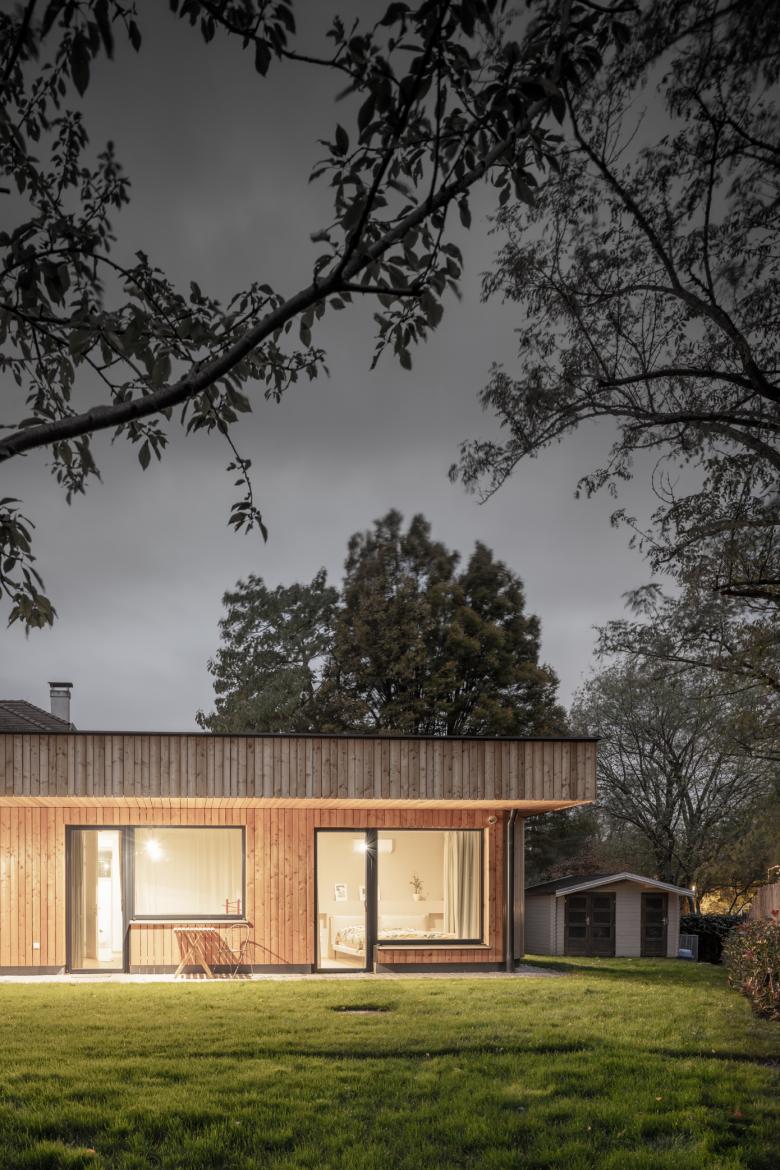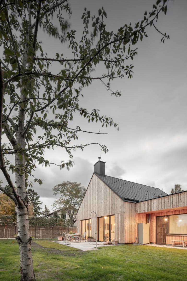 Der Neubau wurde so positioniert, dass anstelle der vorherigen drei Restflächen eine große zusammenhängende Gartenfläche entstand. Diese orientiert sich in Richtung der daneben fließenden Schwechat und somit sind von der Terrasse und vom Garten so gut wie keine Nachbargebäude zu sehen. In diese Richtung öffnet sich das Haus; zu dem direkten Nachbarn auf der gegenüberliegenden Seite bleibt es relativ geschlossen.