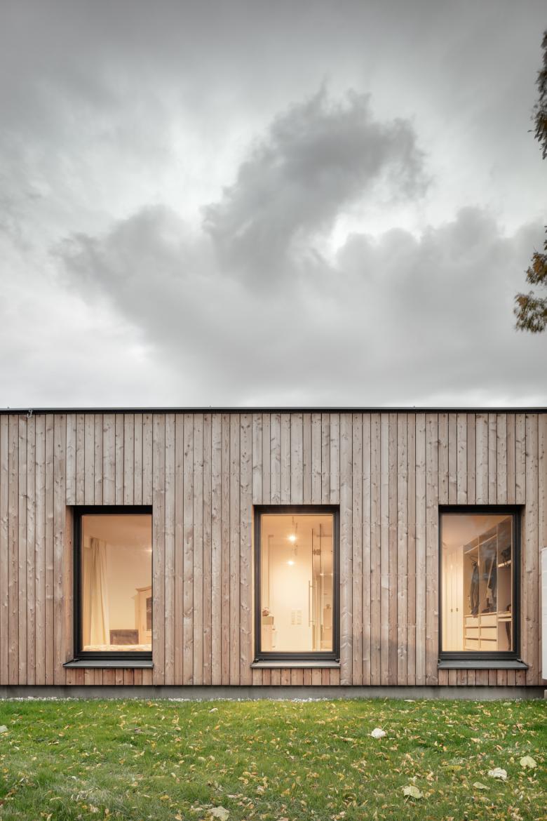 Das Gebäude ist in etwa zur Hälfte untergekellert. Auf der Kellerdecke bzw. Bodenplatte wurde das Haus dann als ebenerdiger Holzbau errichtet. Die vorgefertigten Wandscheiben sind Pfosten-Riegelkonstruktionen mit innerliegender Zellulosedämmung. Für das Dach wurden 2 verschiedene Systeme gewählt. Der Bereich mit den Schlaf- und Badezimmern wurde mittels BrettSperrholzPlatten als Flachdach ausgeführt, der Wohn-Koch-Essbereich erhielt ein Steildach. Dieses wurde ebenfalls vorgefertigt und besteht aus ausgedämmten Rahmenelementen mit einer nachträglich vor Ort montierten hinterlüfteten zusätzlichen Schalung und Aluschindeldeckung. Das Aufrichten des gesamten Holzrohbaus erfolgte in 4 Tagen. Die hinterlüftete Fassade wurde mittels unbehandelten Lärchenbrettern verkleidet, welche über die Zeit vergrauen werden.