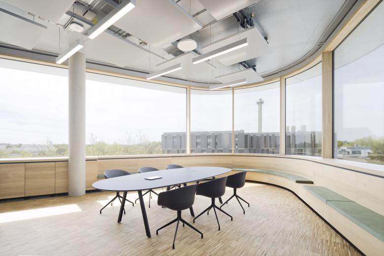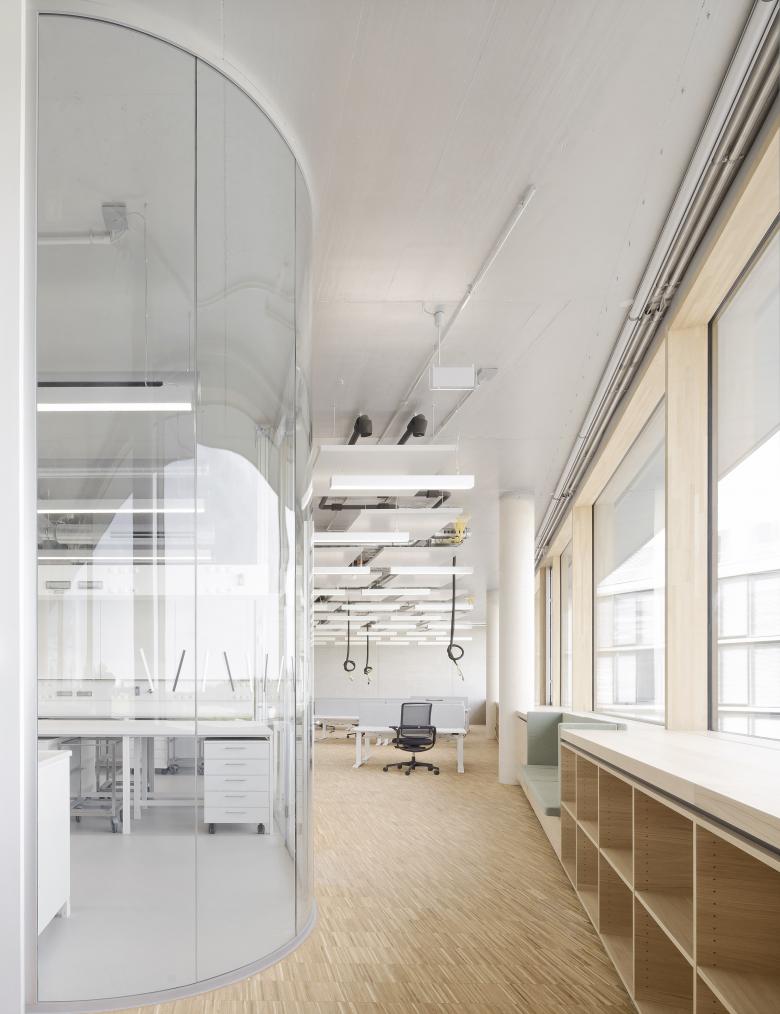 Die gesamte Gebäudestruktur basiert auf zwei spiegelbildlich angeordneten autarken Labormodulen, die an drei Seiten von variabel gestalteten Bürozonen eingerahmt sind. Im Zentrum befindet sich ein großzügiges Atrium mit Kommunikations- und Arbeitsbereichen, in dem Nutzungen über die Geschosse frei angeordnet wurden. Der Atriumsbereich ermöglicht es den Wissenschaftlern aus verschiedenen »Pioneer Groups« in unterschiedlichen Konstellationen und abwechslungsreichen räumlichen Situationen zu kommunizieren und zu recherchieren. Besprechungsräume und Areale für informelles Arbeiten und Präsentieren stehen den Nutzern an den spitz zulaufenden Gebäudeköpfen zur Verfügung. Zwischen ihnen und dem Atrium bilden die sogenannten Flex-Zonen einen flexibel gestaltbaren Übergangsbereich mit Labor- und Bürozonen. Die Labore lassen sich bedarfsgerecht durch Boxen abtrennen, die wie Labormöbel auf- und abgebaut werden.