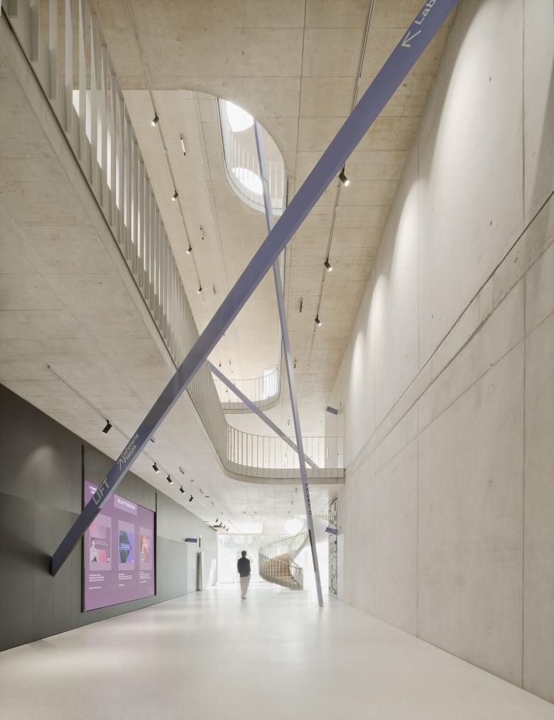 Eingestimmt wird der Besucher bereits beim Betreten des Gebäudes durch das große in Schwarz-Weiß gehaltene Wandbild. Auf allen Ebenen begleitet die Forscher das ungewöhnliche Orientierungssystem, das durch seine Gestaltung aus unterschiedlich langen Bändern zu einer Skulptur wird, die nicht nur den Weg weist, sondern auch die Identität des Hauses kommuniziert.