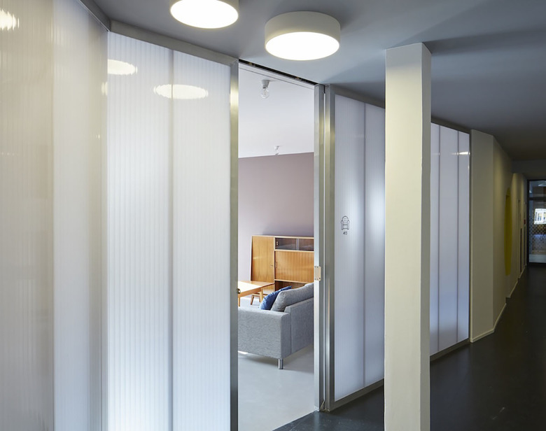 Der Grundraster des bestehenden Internatsgebäudes war vorhanden und gab so die Zimmergrößen vor. Prinzipiell sind Zimmer für 3-Personen konzipiert. Sollte ein Familienverband diese Größe überschreiten, so kann mittels einer Verbindungstür das Nachbarzimmer als ein weiteres Zimmer angekoppelt werden. Im neuen Anbau sind 4-Personenzimmer mit Balkon situiert. Der bestehende Gang mit parallel verlaufenden Wänden vermittelte einen nicht zeitgemäßen Anstaltscharakter. In der Gangmitte wurde aufgrunddessen die alte Wand an einer Seite aufgebrochen und mittels einer Kunststoffverglasung und Schiebetüren aufgelockert. So entsteht Raum zum Verweilen für ein Gespräch, ohne dass Intimität beim Passieren von Mitbewohnern gestört wird. Die Wohnzimmer und Gemeinschaftsräume wurden bewusst mit Kunststoffverglasungen und Schiebeelementen, akustisch nicht sehr wirksam vom Gang getrennt: die „Versuchung“ einer Funktionsänderung durch den ständigen Bedarf an Mehrbetten ist gegeben. Die Qualität des Lebens in der Wohngemeinschaft setzt sich aber im grundlegend aus der Vielfalt der Lebensräume zusammen. Aus der Überzeugung, dass zur notwendigen „Unterbringung“ Räume für das gemeinsame Miteinander wie in einem privaten Familienverband wichtig sind, wurde auf eine Mehrbelegung verzichtet.