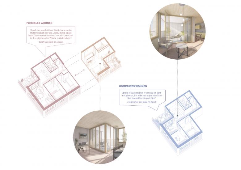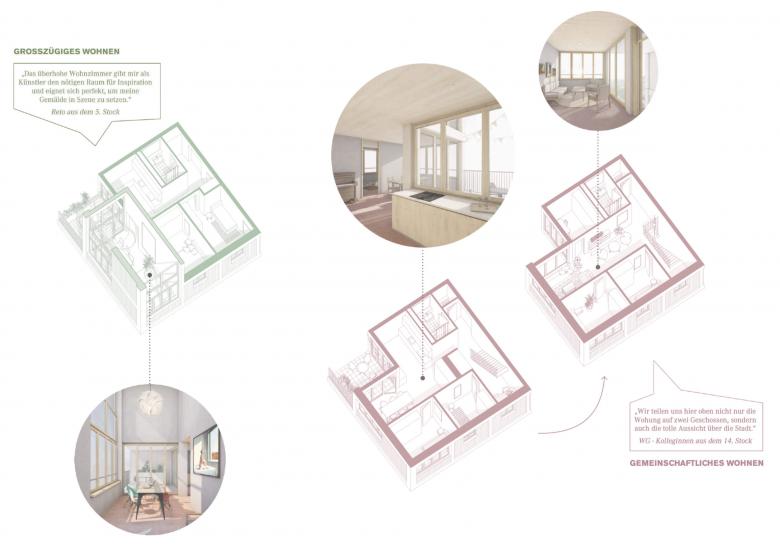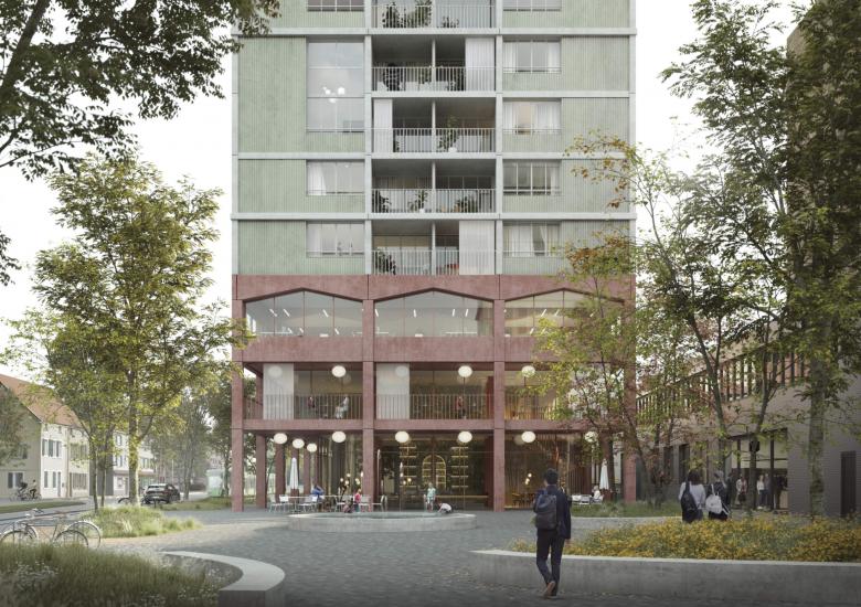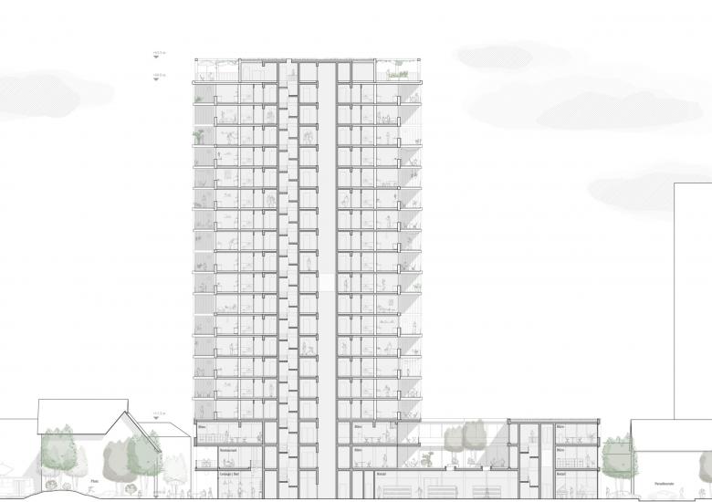 Der Wettbewerbsbeitrag umfasst ein Wohn- und Geschäftshochhaus, dessen Sockelgeschoss die Architektur der historischen Produktionshallen stilisiert aufnimmt. Der Sockel wird mit einem Arkadengang versehen, der den öffentlichen Raum bereichert und die Verbindung zum angrenzenden Freiraum stärkt. Das Hochhaus selbst setzt eine markante städtebauliche Akzentuierung und schafft zusammen mit einem benachbarten Hochhaus eine zentrale grüne Insel, die als öffentlicher Raum dient. Das Gebäude kombiniert verschiedene Nutzungen, von Gewerbeflächen in den unteren Stockwerken bis hin zu Wohnungen im oberen Teil.
