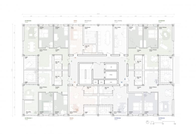 Als tragende Struktur des neuen Gebäudes dient ein Skelettbau, der mit einem durchgängigen Raster gegliedert ist.Geschosse des Sockelbaus werden dabei als ressourceneffiziente Stahlbetonstruktur konzipiert, die Regelgeschosse sind mit Ausnahme des Kerns in Voll-Holzbauweise möglich.