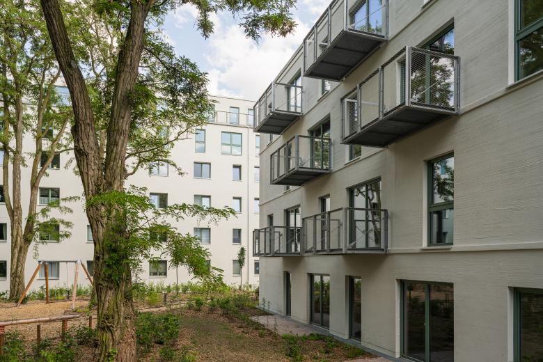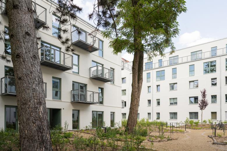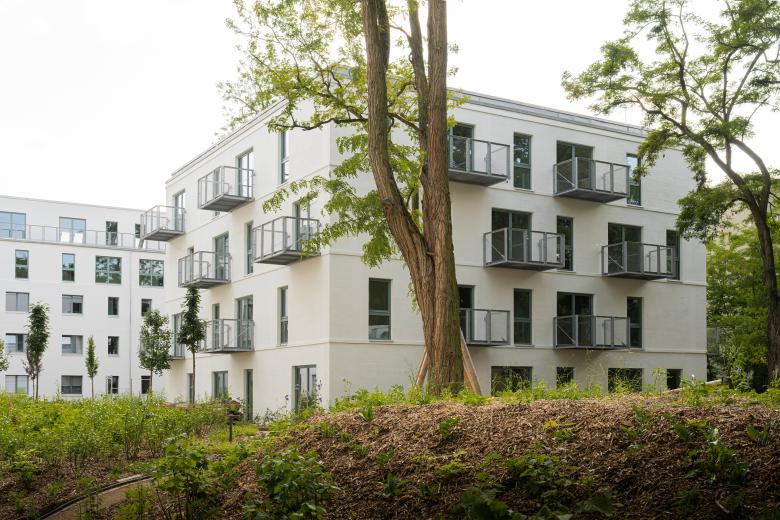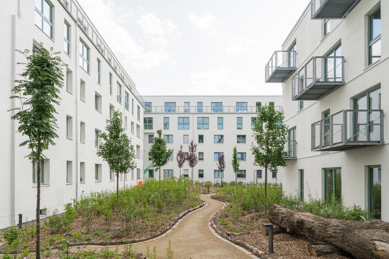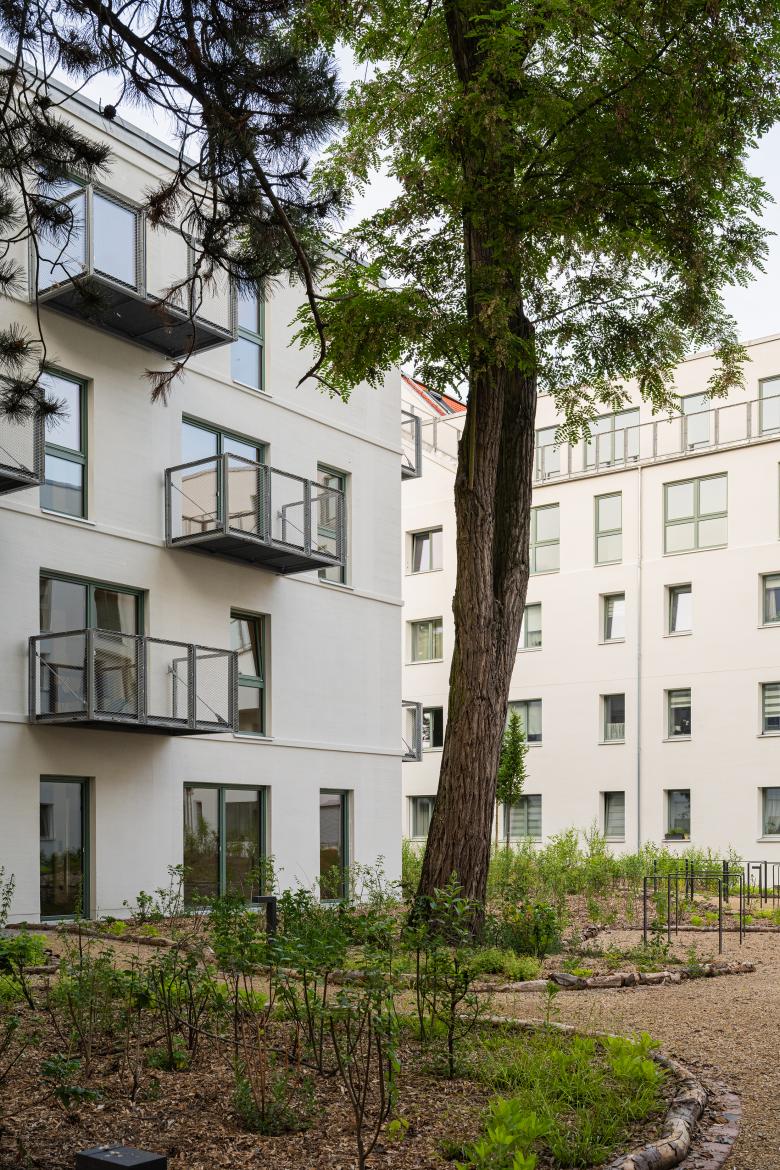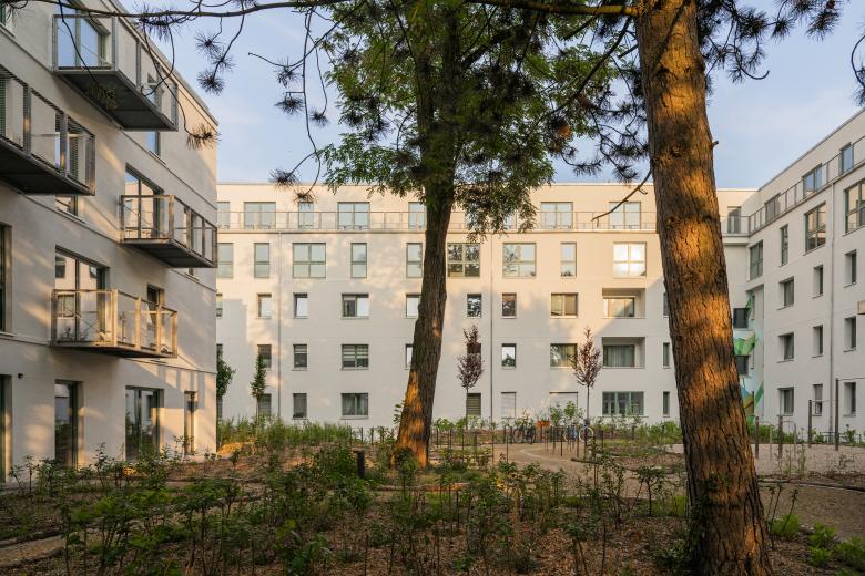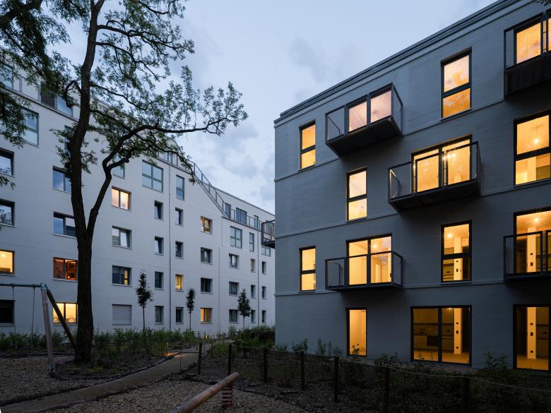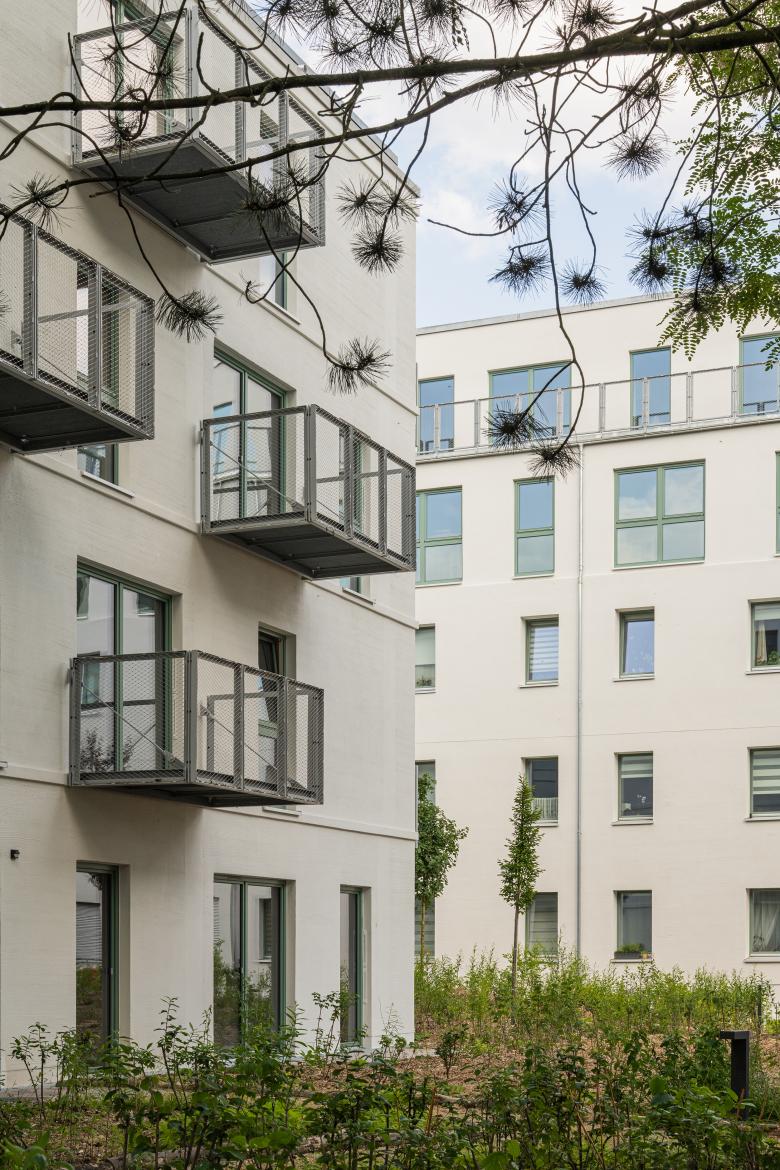 Wo bislang im Bestand einheitliche Zwei-Zimmer-Wohnungen dominierten, kreiert der Entwurf heute Vielfalt: Rund 50 neue Wohnungen entstehen, darunter großzügige Familienwohnungen, von denen der Großteil barrierefrei konzipiert ist. Die neue Durchmischung schafft nicht nur mehr Wohnraum, sondern auch mehr Gemeinschaft und mehr Lebensqualität. Die Quartiersentwicklung folgt damit dem Grundgedanken des sozialen Miteinanders – generationenübergreifend, integrativ und offen. Um die Mieten auf einem verträglichen Niveau zu halten, wurde der Neubau sehr kostenreduziert geplant. Sichtbarer Beton im Treppenkern, sichtbare Holzelemente in den Wohnungen, eine hell verputzte Fassade mit einem leicht grünlichen Ton, der das Gebäude in das Grün des Innenhofs bettet. Die Gestaltung des Außenraums geht Hand in Hand mit der architektonischen Intention. Durch die Entscheidung zum Bau eines Sicherheitstreppenraums im Neubau kann der gesamte Innenhof von Feuerwehrzufahrten und -stellflächen freigehalten werden und wird stattdessen intensiv begrünt. In freier Anordnung entstehen grüne Inseln mit Streuobstbäumen, Beerenstauden und anderer Flora, die für eine hohe Biodiversität sorgen und eine innerstädtische Oase schaffen.