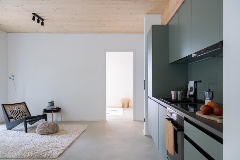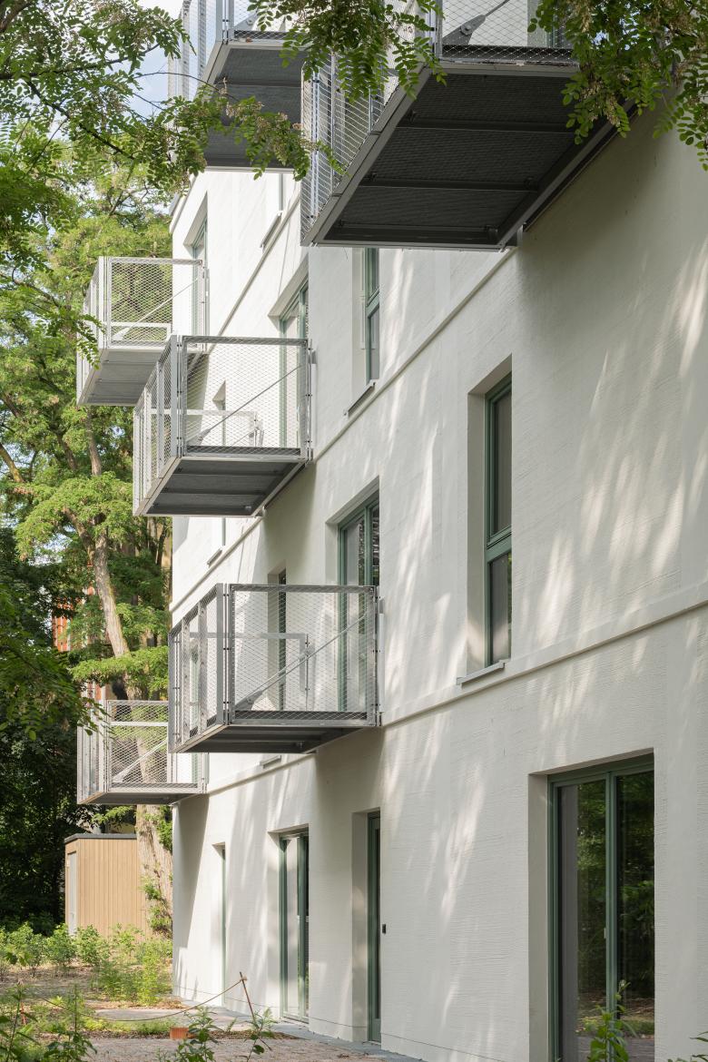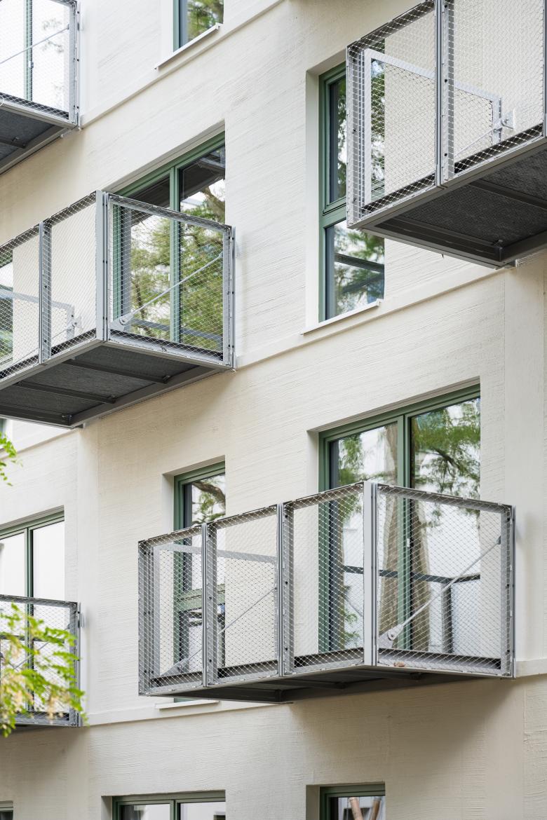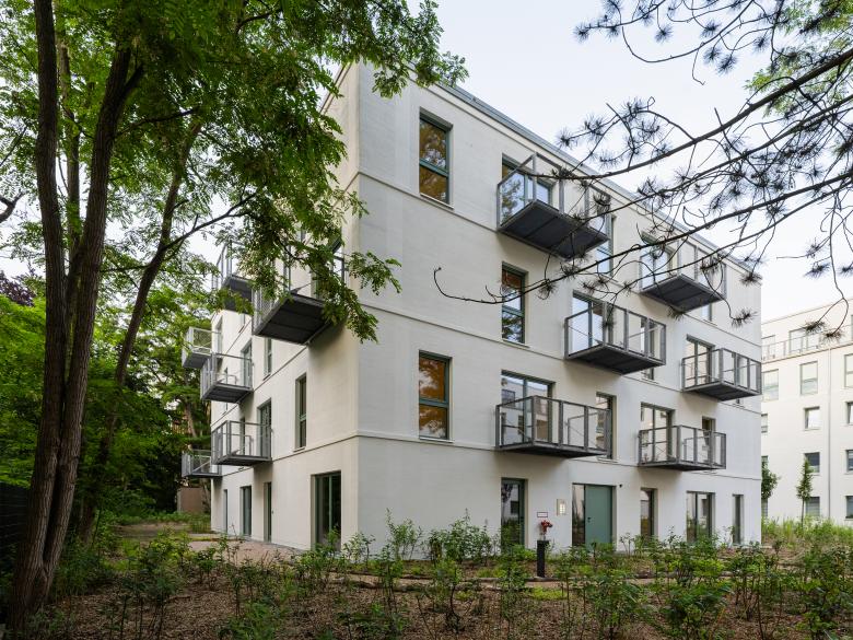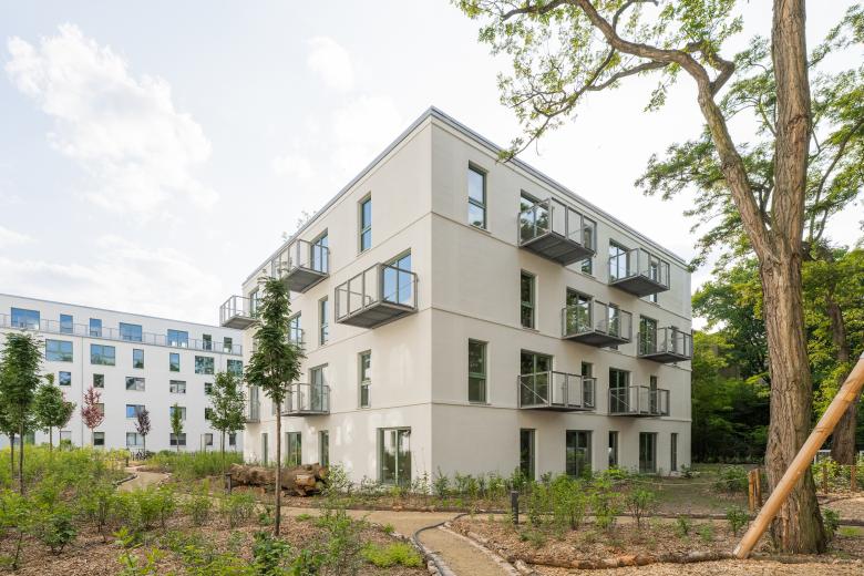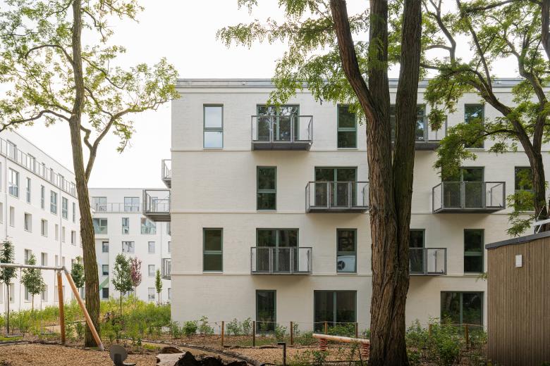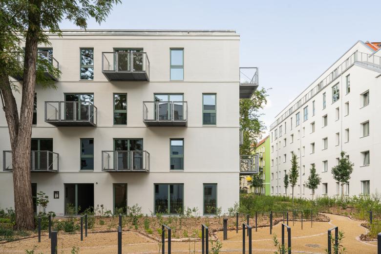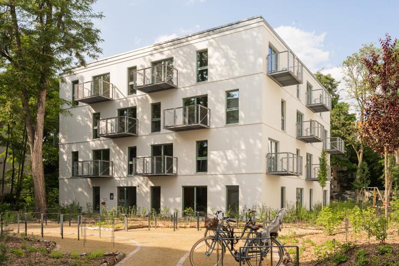 Wo bislang im Bestand einheitliche Zwei-Zimmer-Wohnungen dominierten, kreiert der Entwurf heute Vielfalt: Rund 50 neue Wohnungen entstehen, darunter großzügige Familienwohnungen, von denen der Großteil barrierefrei konzipiert ist. Die neue Durchmischung schafft nicht nur mehr Wohnraum, sondern auch mehr Gemeinschaft und mehr Lebensqualität. Die Quartiersentwicklung folgt damit dem Grundgedanken des sozialen Miteinanders – generationenübergreifend, integrativ und offen. Um die Mieten auf einem verträglichen Niveau zu halten, wurde der Neubau sehr kostenreduziert geplant. Sichtbarer Beton im Treppenkern, sichtbare Holzelemente in den Wohnungen, eine hell verputzte Fassade mit einem leicht grünlichen Ton, der das Gebäude in das Grün des Innenhofs bettet. Die Gestaltung des Außenraums geht Hand in Hand mit der architektonischen Intention. Durch die Entscheidung zum Bau eines Sicherheitstreppenraums im Neubau kann der gesamte Innenhof von Feuerwehrzufahrten und -stellflächen freigehalten werden und wird stattdessen intensiv begrünt. In freier Anordnung entstehen grüne Inseln mit Streuobstbäumen, Beerenstauden und anderer Flora, die für eine hohe Biodiversität sorgen und eine innerstädtische Oase schaffen.