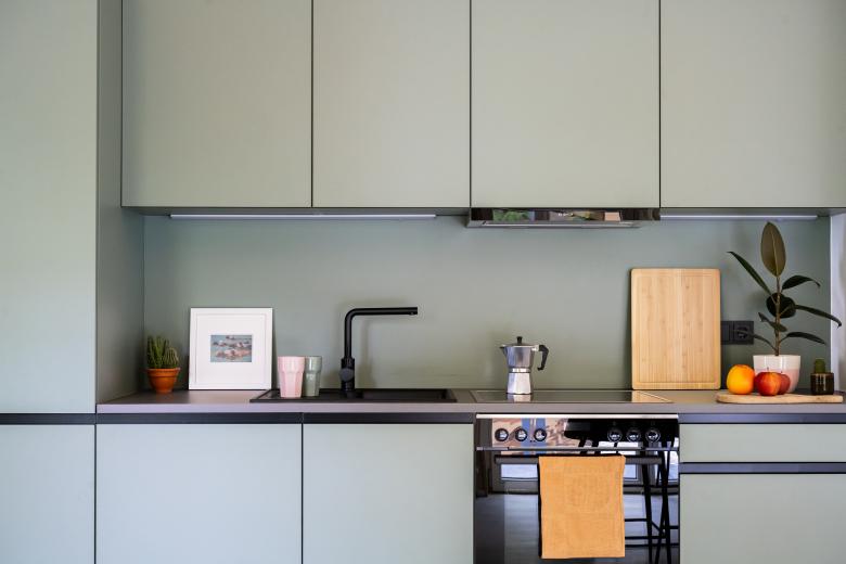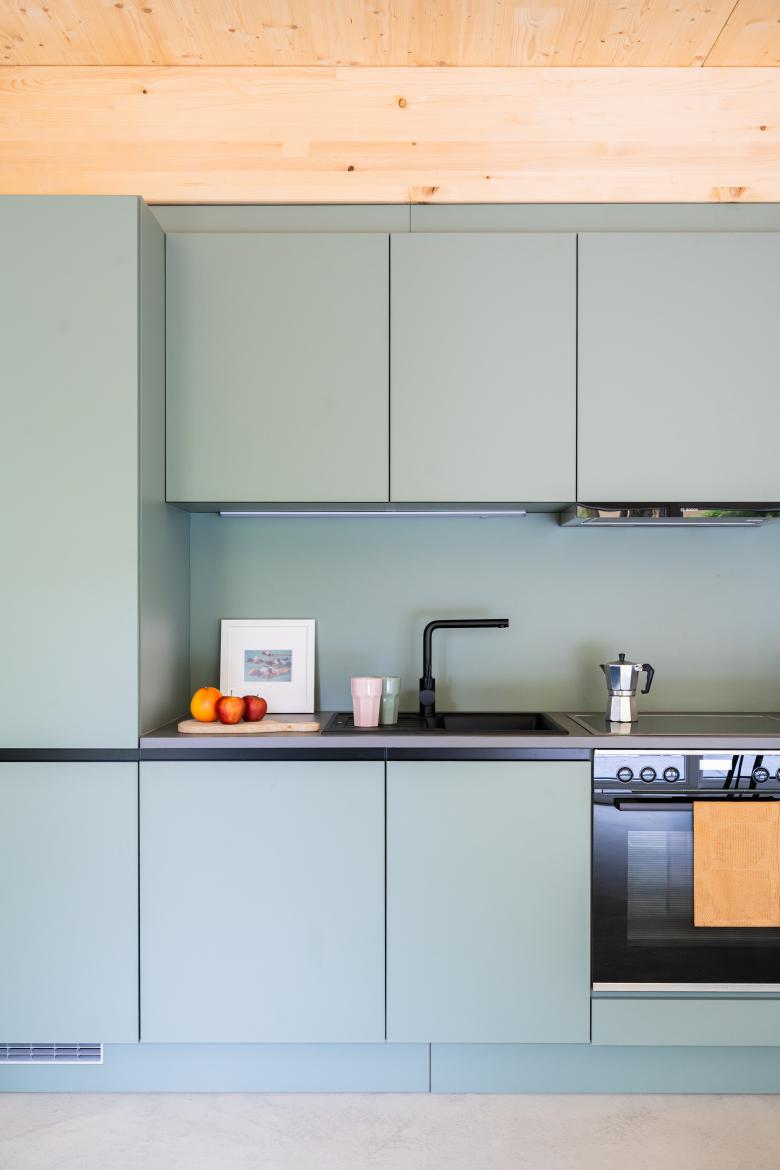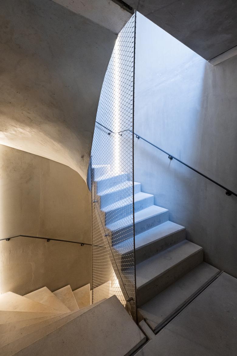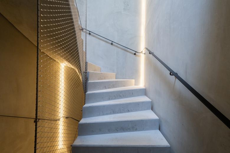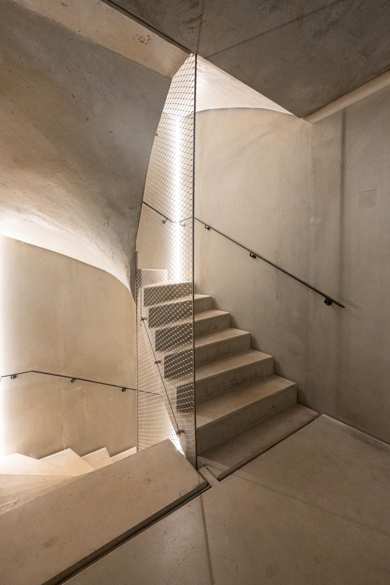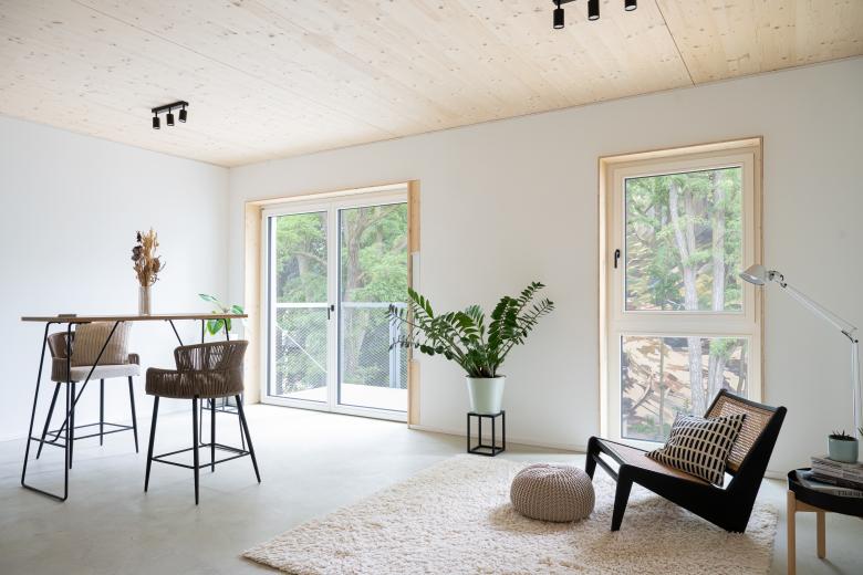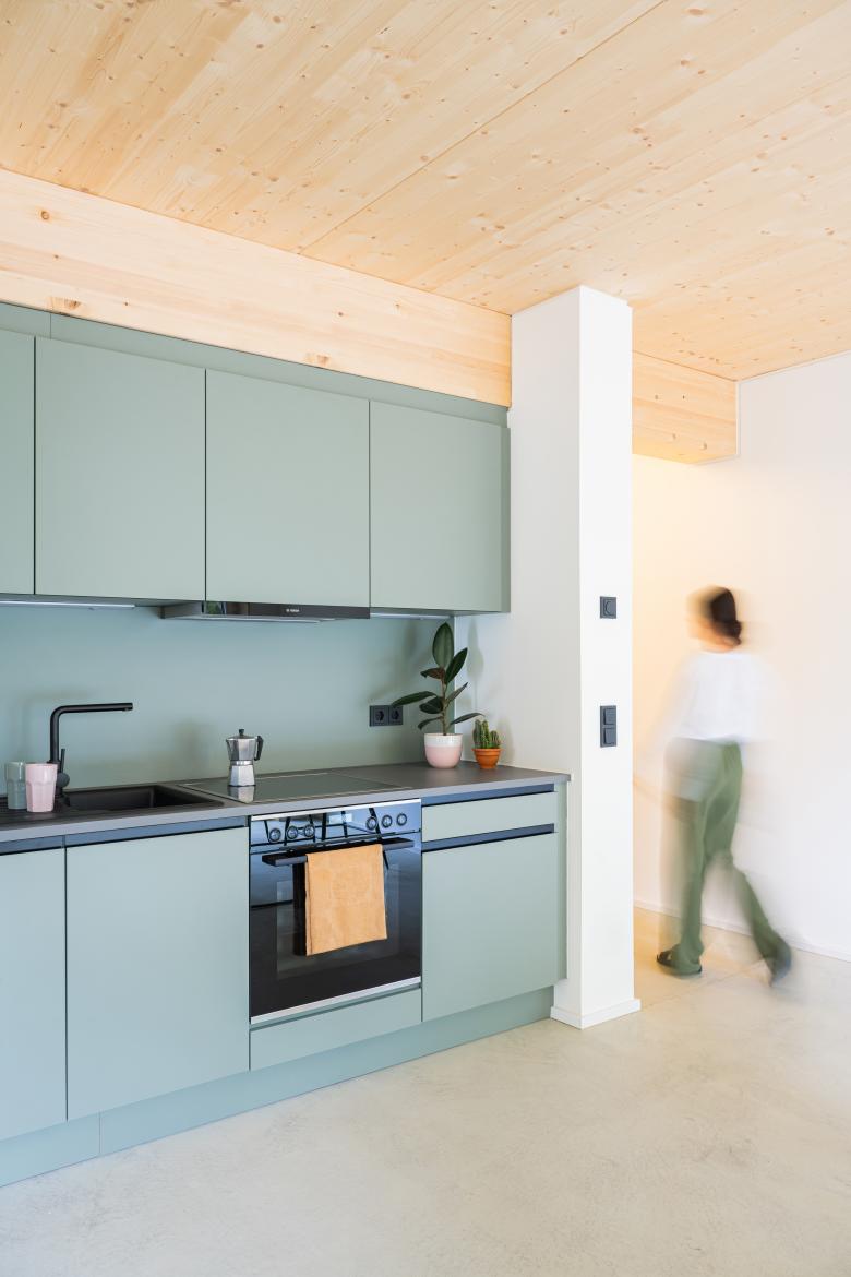 Wo bislang im Bestand einheitliche Zwei-Zimmer-Wohnungen dominierten, kreiert der Entwurf heute Vielfalt: Rund 50 neue Wohnungen entstehen, darunter großzügige Familienwohnungen, von denen der Großteil barrierefrei konzipiert ist. Die neue Durchmischung schafft nicht nur mehr Wohnraum, sondern auch mehr Gemeinschaft und mehr Lebensqualität. Die Quartiersentwicklung folgt damit dem Grundgedanken des sozialen Miteinanders – generationenübergreifend, integrativ und offen. Um die Mieten auf einem verträglichen Niveau zu halten, wurde der Neubau sehr kostenreduziert geplant. Sichtbarer Beton im Treppenkern, sichtbare Holzelemente in den Wohnungen, eine hell verputzte Fassade mit einem leicht grünlichen Ton, der das Gebäude in das Grün des Innenhofs bettet. Die Gestaltung des Außenraums geht Hand in Hand mit der architektonischen Intention. Durch die Entscheidung zum Bau eines Sicherheitstreppenraums im Neubau kann der gesamte Innenhof von Feuerwehrzufahrten und -stellflächen freigehalten werden und wird stattdessen intensiv begrünt. In freier Anordnung entstehen grüne Inseln mit Streuobstbäumen, Beerenstauden und anderer Flora, die für eine hohe Biodiversität sorgen und eine innerstädtische Oase schaffen.