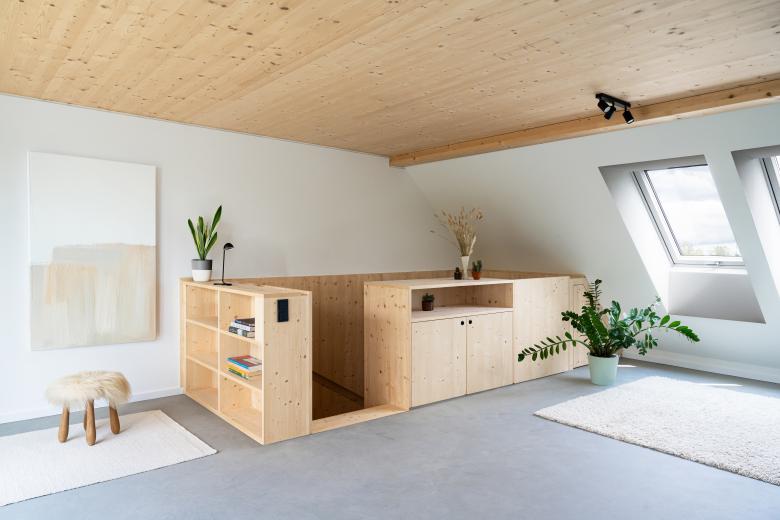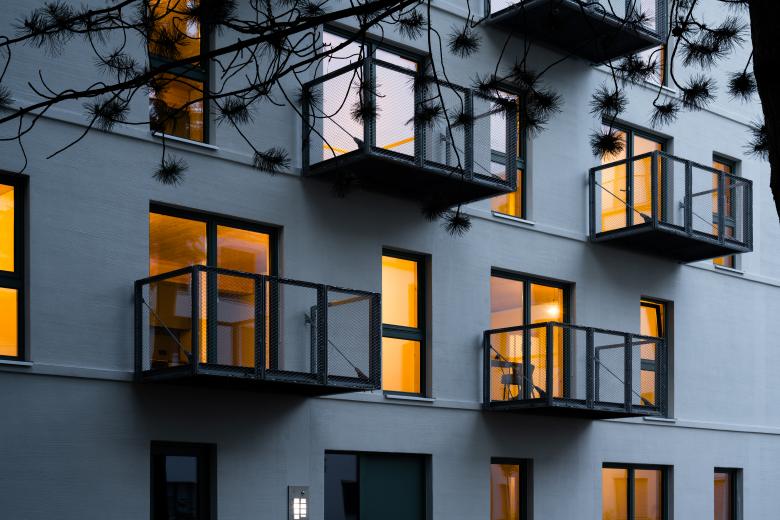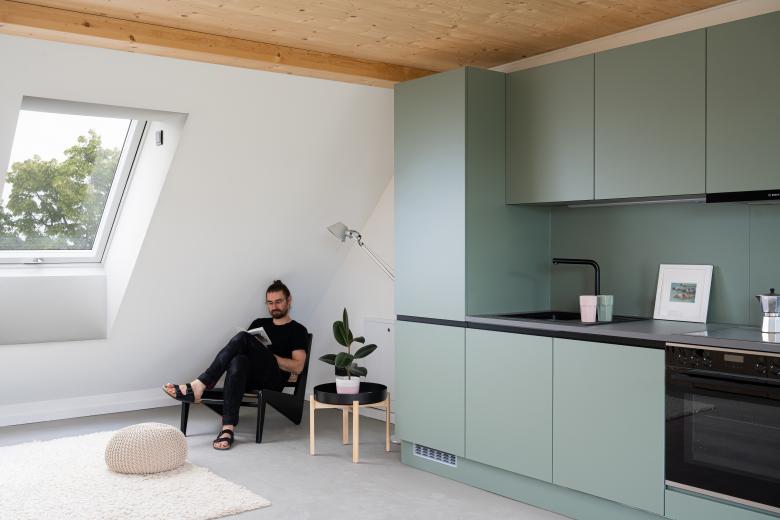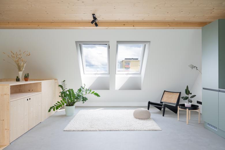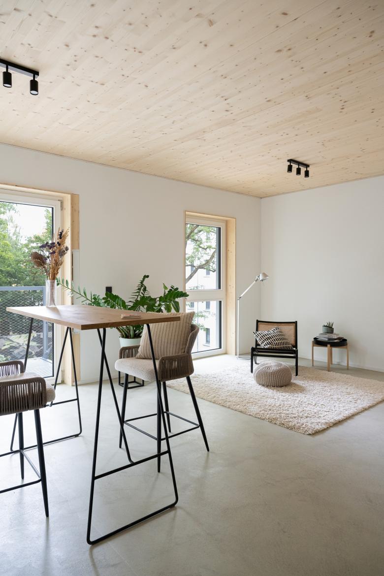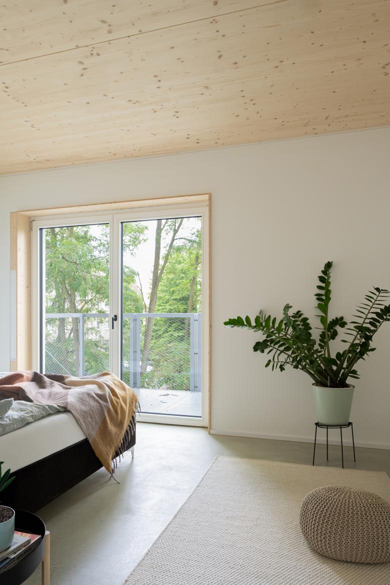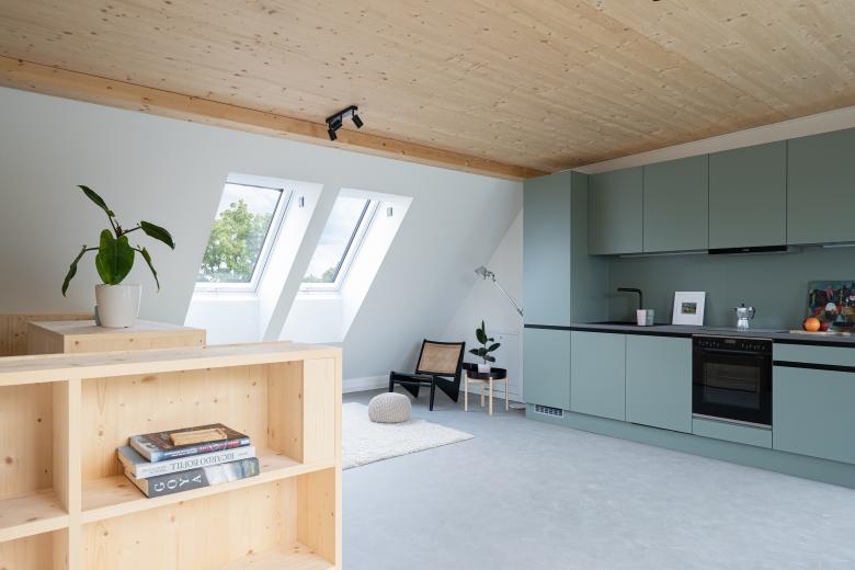 Zwei zentrale Ansätze tragen das Projekt: Zum einen ging es noch ohne konkretes Grundstück darum, einen Baukasten für innovativen und bezahlbaren Wohnungsbau in Holzbau zu entwickeln. Wie schaffe ich auf möglichst wenig Fläche mit möglichst viel Raumqualität und kann die mit möglichst hohem Vorfertigungsgrad in möglichst kurzer Zeit bauen? Zum anderen ging es dann am konkreten Projekt um einen respektvollen, aber zugleich neugierig ambitionierten Umgang mit dem Bestand. Das markante Eckgebäude mit seiner zeittypischen Fassade aus Putz und Klinker und seiner horizontalen Gliederung wird um zwei Geschosse in Holzbauweise aufgestockt. Der Eingriff ist von der Straßenseite kaum wahrnehmbar, da die Geometrie des steilen Satteldachs nicht verändert wurde. Ergänzend entsteht im ruhigen Blockinnenbereich ein viergeschossiger freistehender Neubaukörper, ebenfalls in Holzbauweise, der das Ensemble behutsam ergänzt und gleichzeitig eine deutliche qualitative Aufwertung schafft.