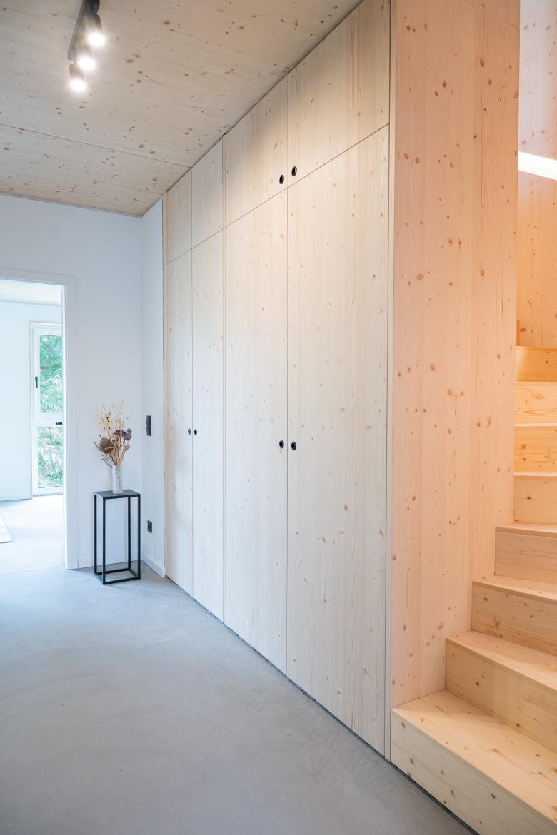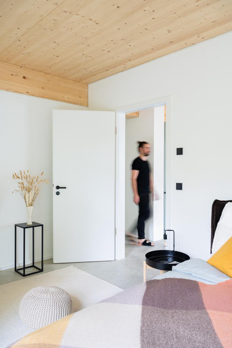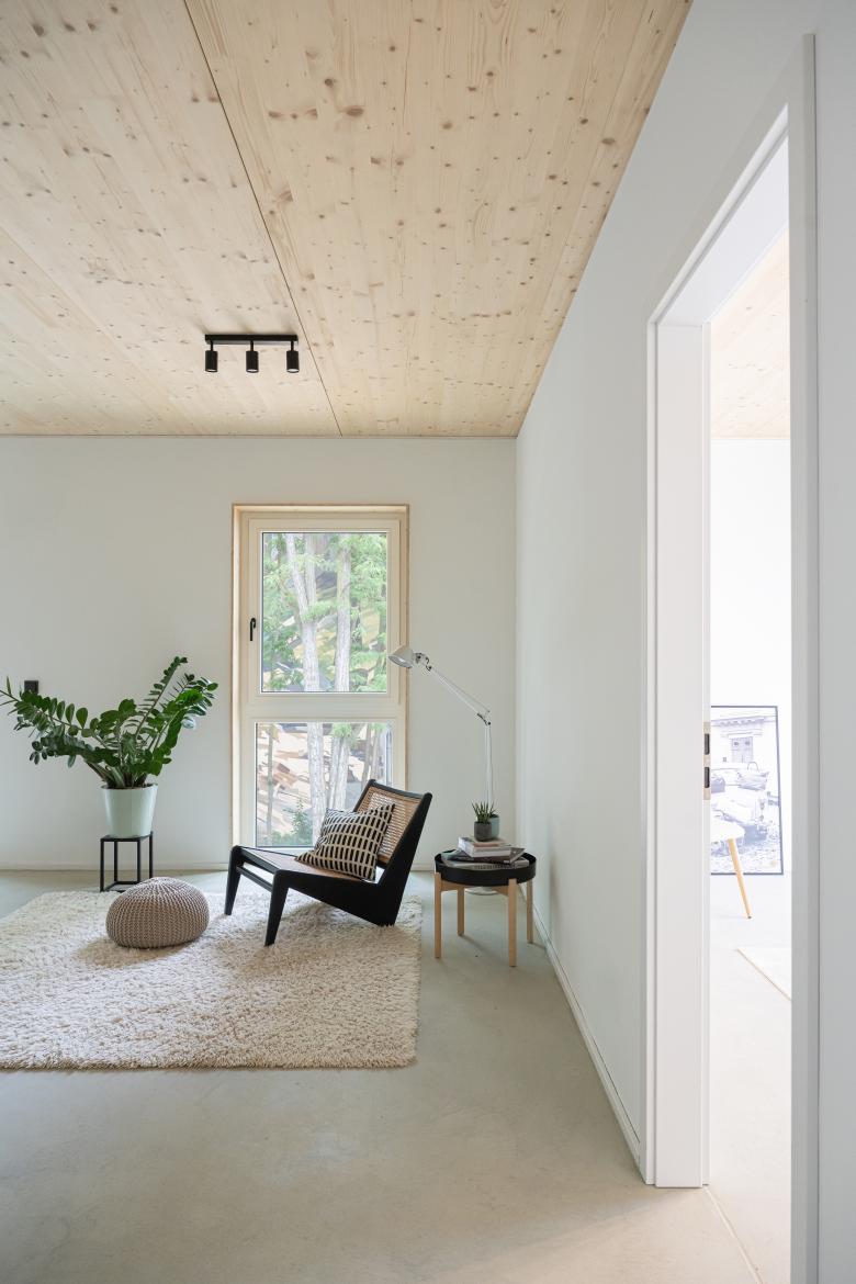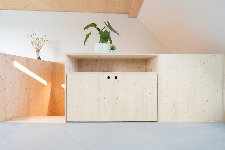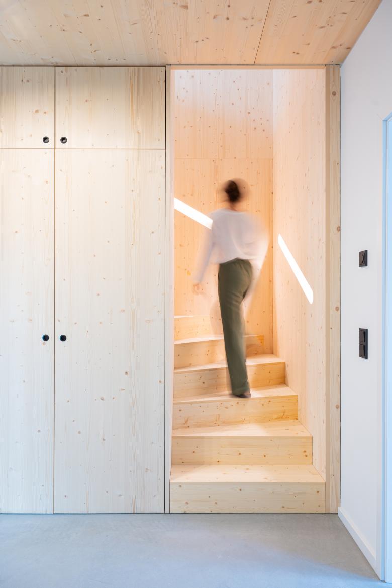 Zwei zentrale Ansätze tragen das Projekt: Zum einen ging es noch ohne konkretes Grundstück darum, einen Baukasten für innovativen und bezahlbaren Wohnungsbau in Holzbau zu entwickeln. Wie schaffe ich auf möglichst wenig Fläche mit möglichst viel Raumqualität und kann die mit möglichst hohem Vorfertigungsgrad in möglichst kurzer Zeit bauen? Zum anderen ging es dann am konkreten Projekt um einen respektvollen, aber zugleich neugierig ambitionierten Umgang mit dem Bestand. Das markante Eckgebäude mit seiner zeittypischen Fassade aus Putz und Klinker und seiner horizontalen Gliederung wird um zwei Geschosse in Holzbauweise aufgestockt. Der Eingriff ist von der Straßenseite kaum wahrnehmbar, da die Geometrie des steilen Satteldachs nicht verändert wurde. Ergänzend entsteht im ruhigen Blockinnenbereich ein viergeschossiger freistehender Neubaukörper, ebenfalls in Holzbauweise, der das Ensemble behutsam ergänzt und gleichzeitig eine deutliche qualitative Aufwertung schafft.