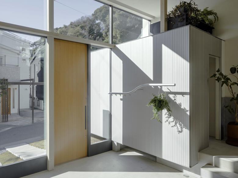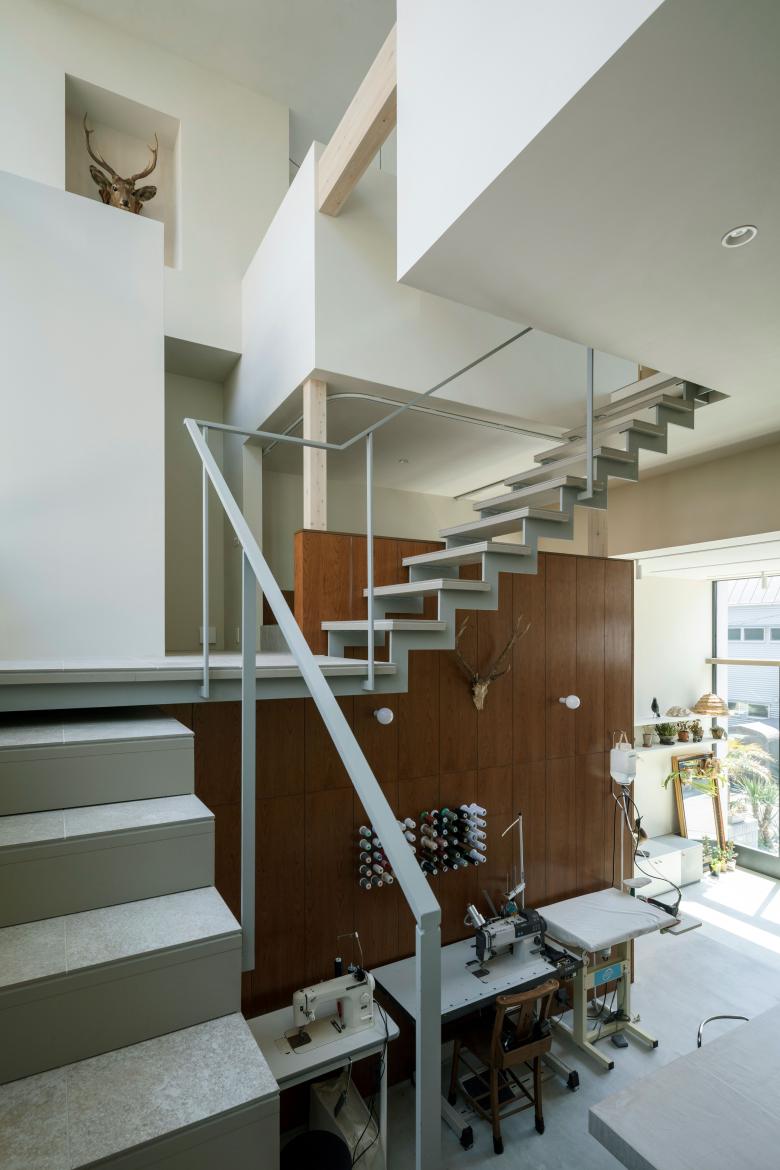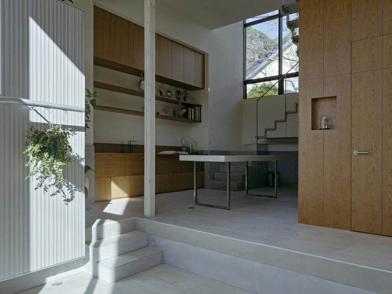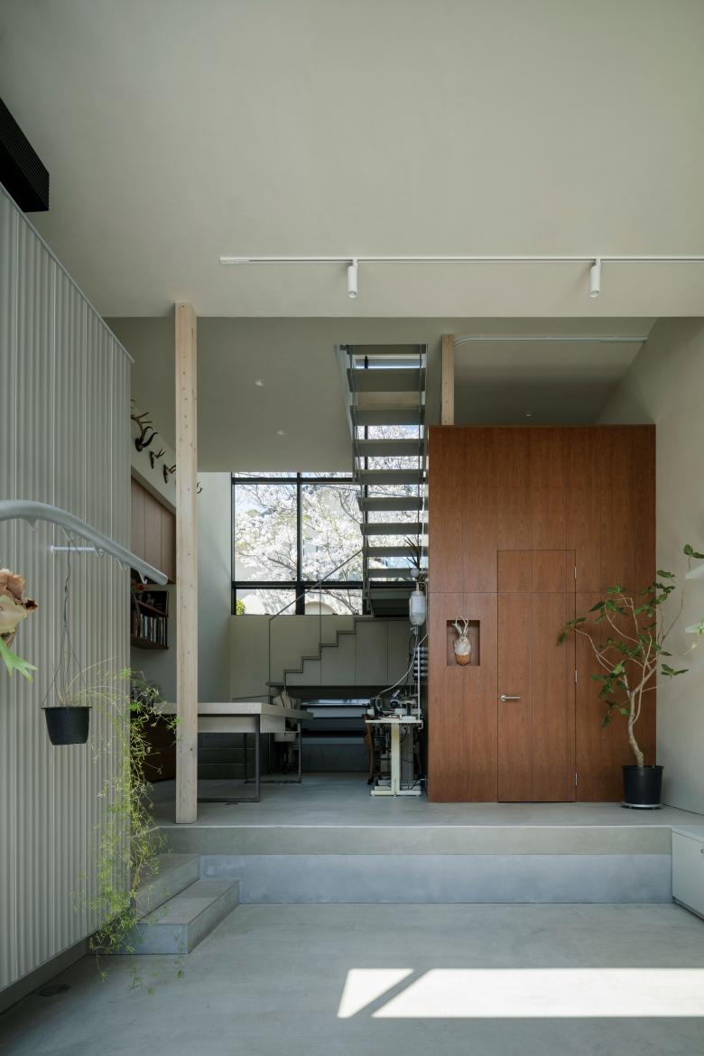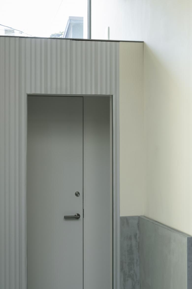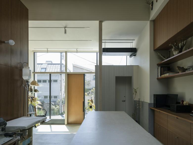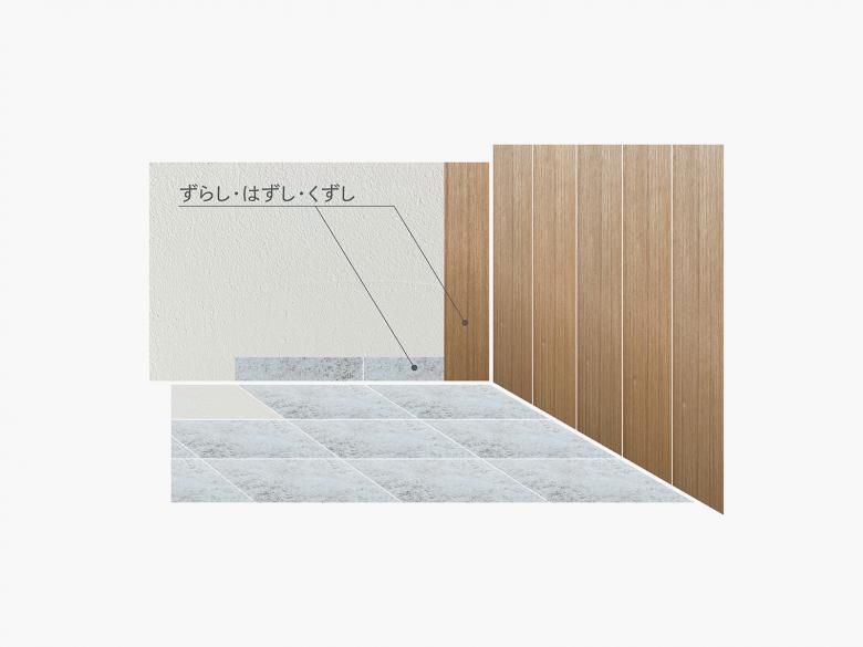 アヴァンギャルドなアパレルを手がけるデザイナー夫妻のための、アトリエ併設住宅である。本計画は、ファッションにおける〈ずらす〉〈はずす〉〈くずす〉という操作を、建築に拡張する試みである。仕上材はあえて余剰を見込まず実数で発注し、現場で生じた材料の不足や余りに即興で応答することで、入隅・出隅に“ずれ”を持ち込む納まりとした。慣習的な納まりからの脱却であると同時に、素材廃棄の削減にもつながっている。平面構成もこの操作と連動しており、異なる素材で仕上げた機能コアが、ワンルーム空間に縫い込まれるように配置されている。ファッションの文脈から引き出されたこれらの操作により、建築と素材の関係に批評的な厚みを与え、空間の均質性や設計の規範を問い直すことを試みた。