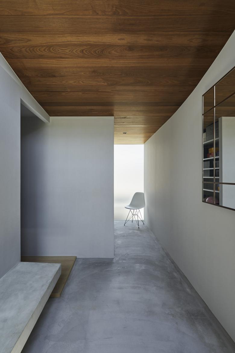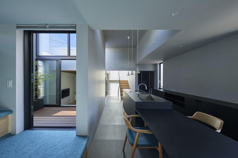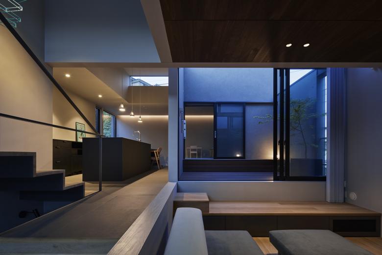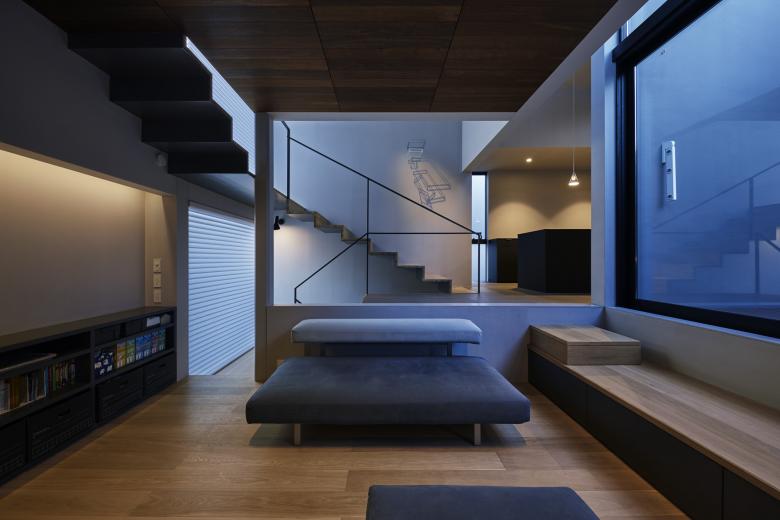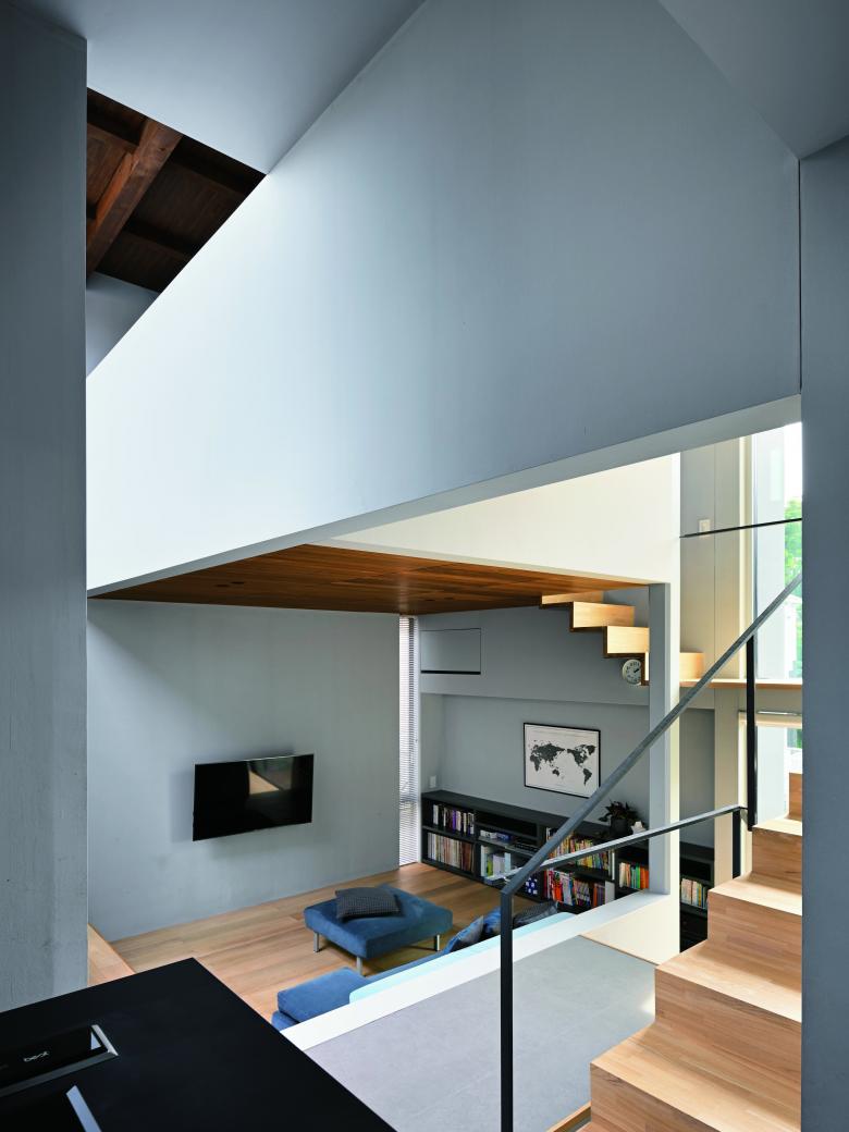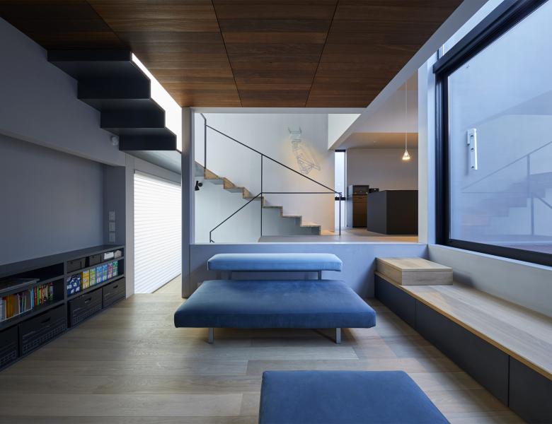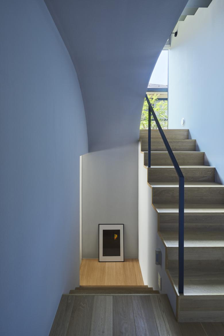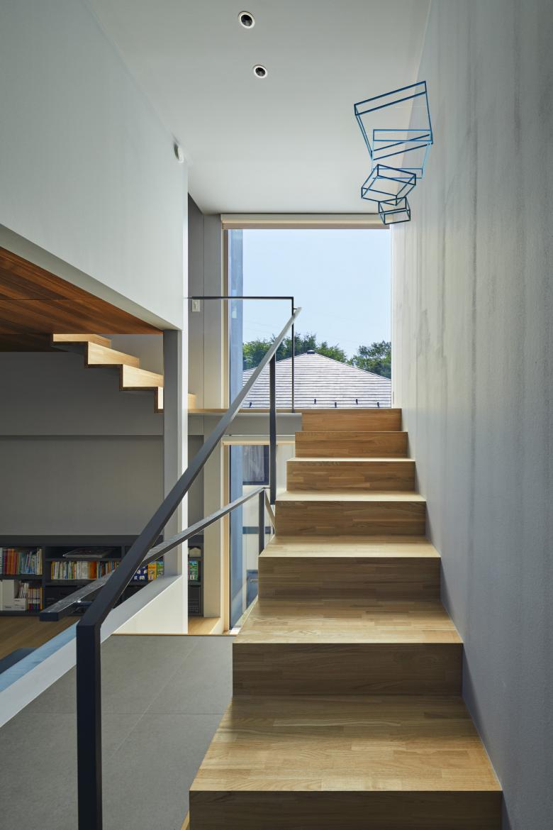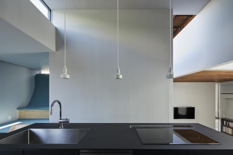 周辺の擁壁と造成地の合間を縫う坂道のように、内部では壁とスキップする床を縫い合わせる動線が立体的に折り畳まれ、一続きの内部空間が生まれた。移動するたびにフレーミングされた開口部から垣間見える高低差のある景色の展開により、内部と外部が連続する体験が生まれる。