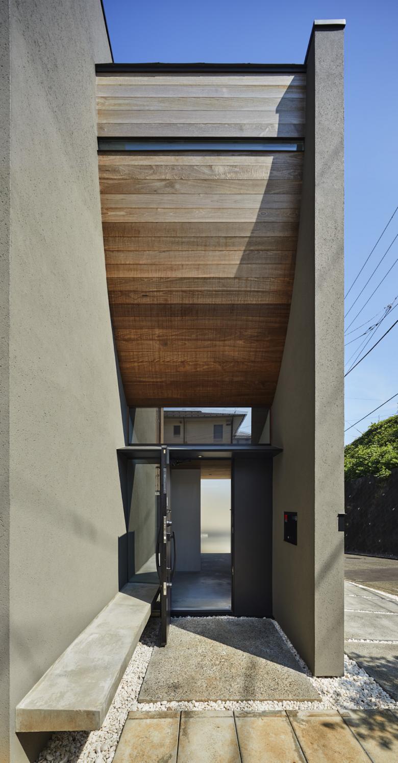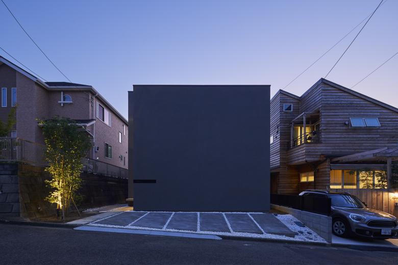 ここでは造成地に特有な高低差を伴った地形に対し、周辺の光や風、視線を制御するように外壁と屋根を立上げ、壁と壁の合間、屋根と屋根の合間に開口部を設ける構成とした。