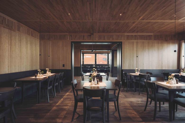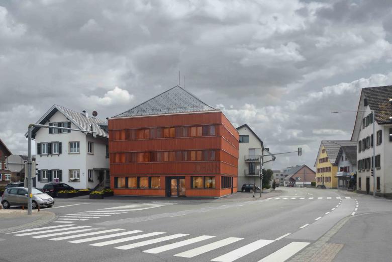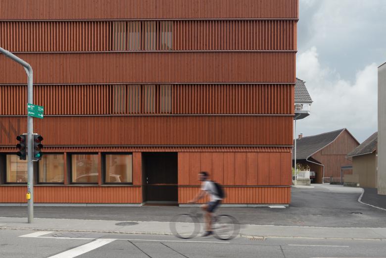 Die Fassaden sind in ein tiefes, warmes Rostrot getaucht, eine Farbe, die an einigen benachbarten Holzhäusern bereits zu finden ist. Das Material Holz und die warme Farbe sollen der Unwirtlichkeit der stark befahrenen Kreuzung entgegenwirken. Ein Möbel in der Stadt. Die Hotelnutzung in den Obergeschossen wird durch eine Fassade aus fixen Holzlamellen verhüllt. Die Gaststuben im Erdgeschoss sind großzügig verglast, die Ein- und Ausblicke sind durch tiefe Leibungen gerahmt.