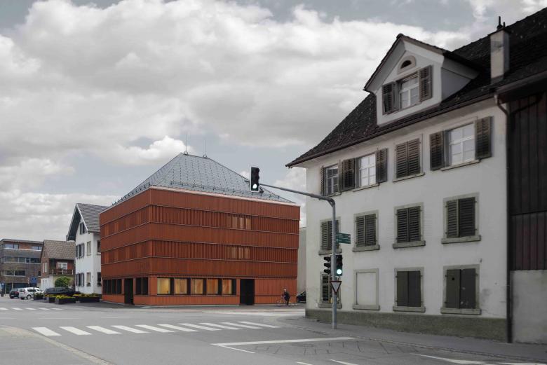 In markanter Lage, direkt an der Kreuzung mit Eingang zum Platz, stand der Gasthof Engel. Von der Mitte des 19. Jahrhunderts an bis heute war hier ein Gastronomiebetrieb, teilweise auch kombiniert mit Einzelhandel. Entsprechend hoch ist auch die Verankerung dieses Treffpunktes im Bewusstsein der Bevölkerung. Vor diesem Hintergrund wollten wir ein Haus planen, das so oder so ähnlich auch früher an dem Ort hätte stehen können. Ein Haus mit Holzfassaden und Walmdach, das sich in der Volumetrie und Materialsprache auf historische Bauten im Zentrum bezieht.