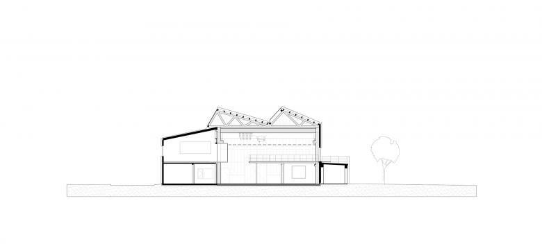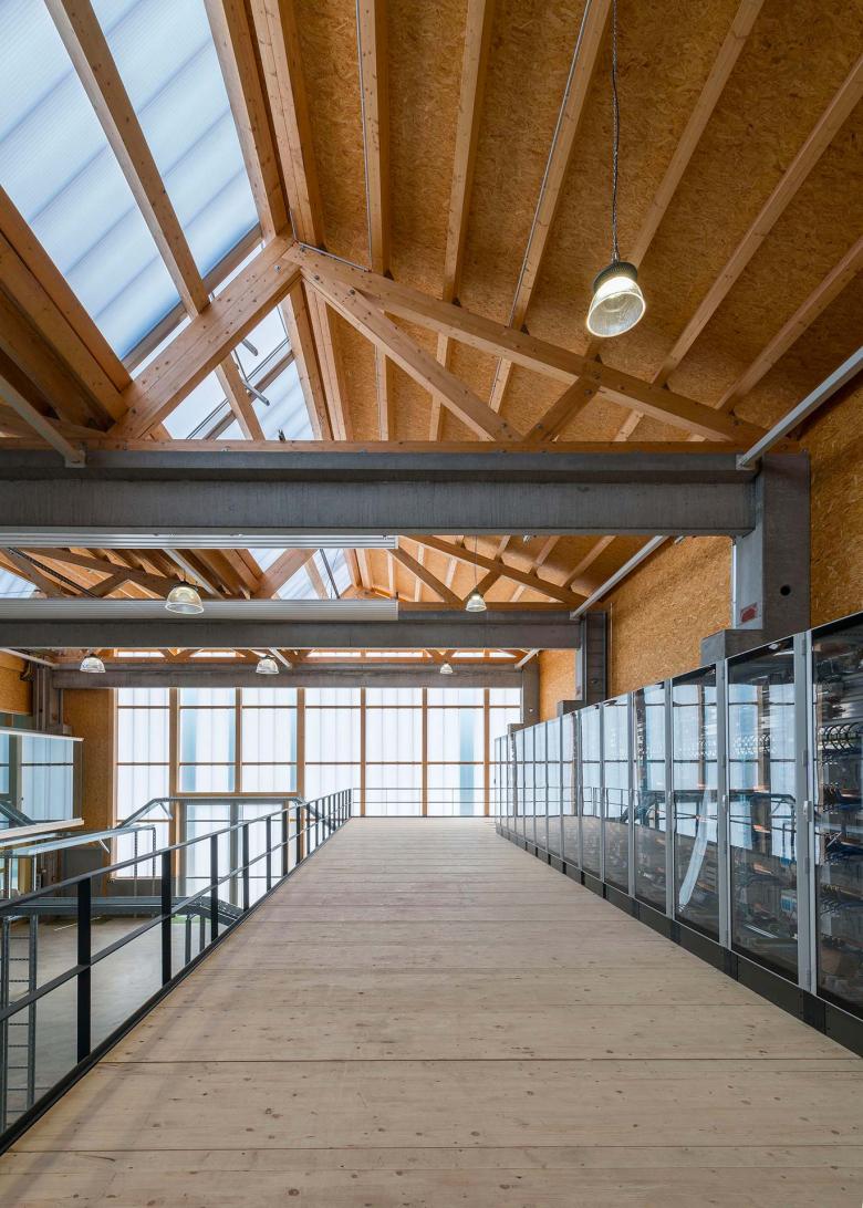 The material of the hall incorporates references to the neighbouring buildings with their industrial character. Window openings set in specific places in the office facade enable a selective illumination of the interior spaces with their unobtrusive design. While here wood and simple glass facades are the dominant design element, the hall is characterized by the polycarbonate facade and the wooden construction of the saw-tooth roof.