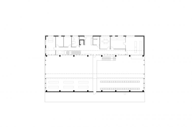 The main approach is from the west via a glass vestibule in the central zone of access, which leads between the offices and the hall, alongside a lightweight glass wall, into the building, allowing generous views between these building sections. The right side opens up onto a hall, while the office spaces are aligned on the left. The control station, the test preparation area, the meeting rooms and the auxiliary rooms are also located here. In the building centre, a stairway and elevator lead to the upper storey, where additional office and preparation rooms are located, as well as a small staff kitchen with seating. The rooms allocated to the test areas are adjacent to the hall atrium and provide direct views into this open space.